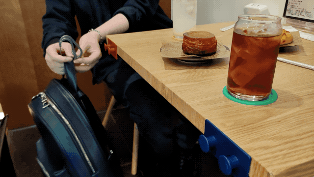 必要な時にサッと「TiHook2」を取り出せて、テーブルや椅子にかけられます。