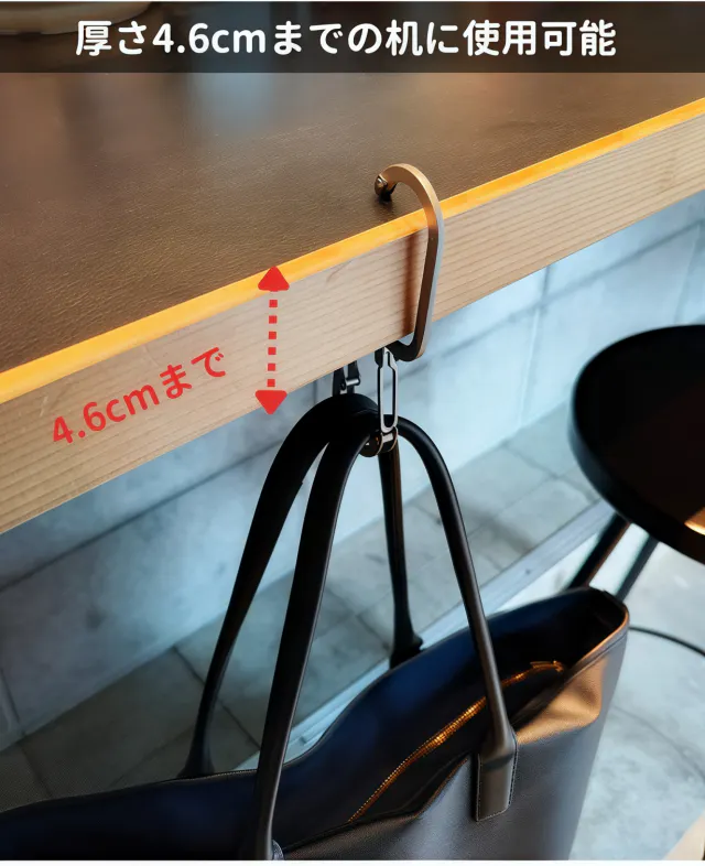 可動部分は4.6cmまで開くので、椅子の背もたれや厚みのあるテーブルなど、さまざまな場所に引っ掛けて使えます。