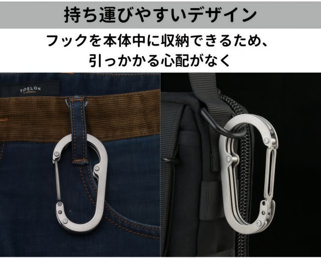 今回のバッグハンガーは、フック部分を本体内部に収納できる構造になっており、普段は軽量で頑丈なチタン製カラビナとして活躍します。