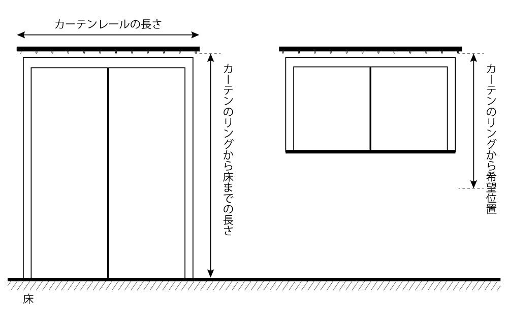 カーテンレールの長さ(幅)と、カーテンレールのランナーについているリングから下の長さ(丈、カン下寸法)を測ります。