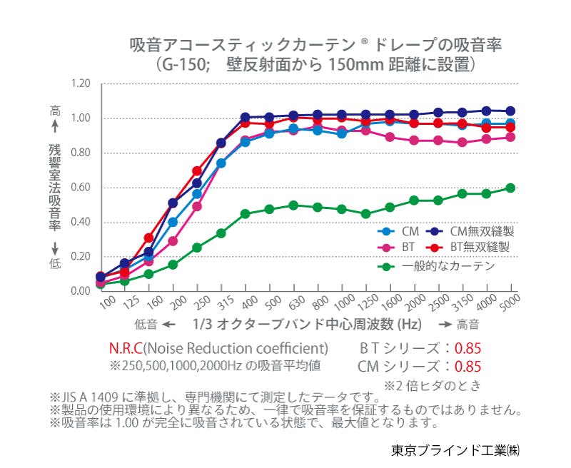 吸音アコースティックカーテンは、一般的なドレープカーテンと比較して2倍以上の吸音性能を持つドレープカーテンです。