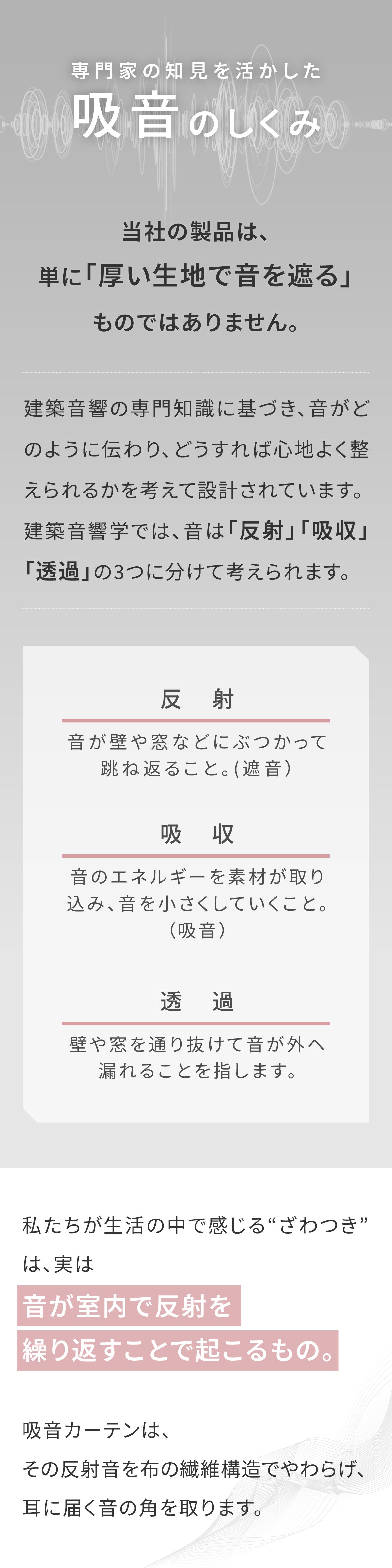 私たちの吸音カーテンは、この「吸音」に焦点を当てています。