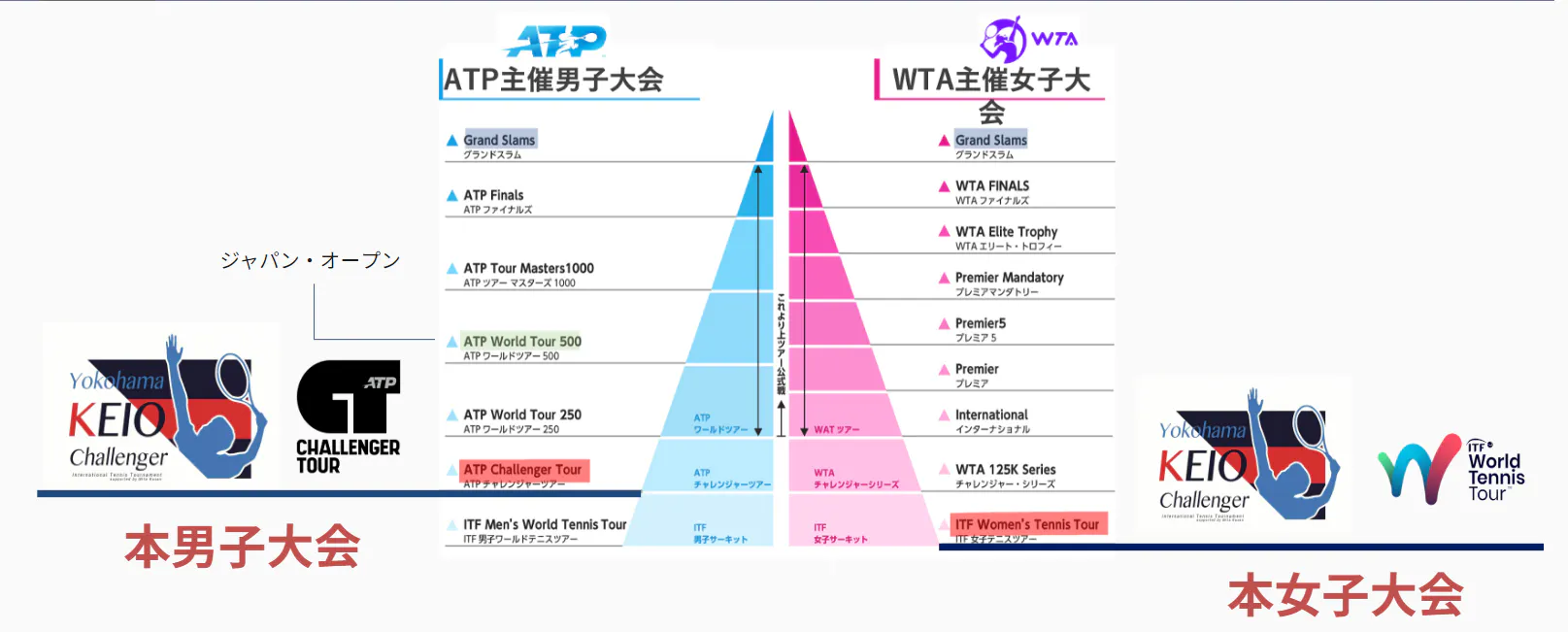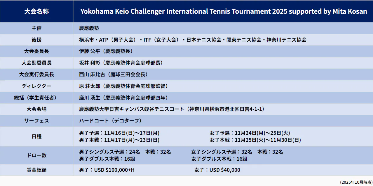 横浜慶應チャレンジャー2025 supported by 三田興産 大会概要ATPチャレンジャー大会(男子大会)とITFサーキット(女子大会)を2週連続で開催する国際テニス大会です。男子大会は、男子国際テニスツアー公式戦(ATP)に属する大会で、世界ランキング70位から400位の選手、将来有望な選手が多数出場予定です。女子大会は、国際テニス連盟(ITF)主催の大会であり、世界女子テニスツアー公式戦(WTA)への登竜門となっています。