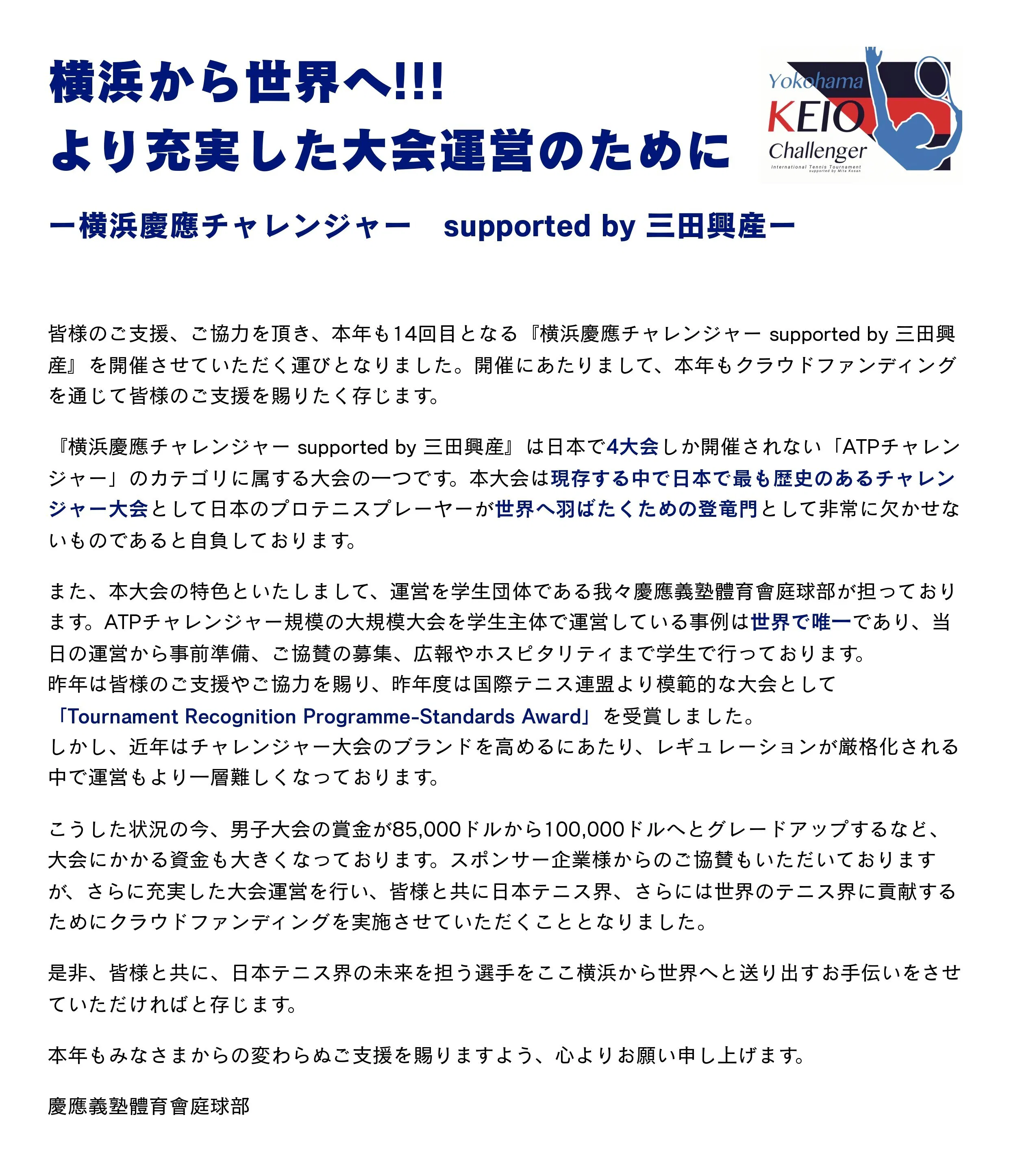 みなさまのお力もお借りしながら、継続的に横浜慶應チャレンジャ― supported by 三田興産を開催し、日本テニス界のさらなる発展に寄与していきたいと考えております。