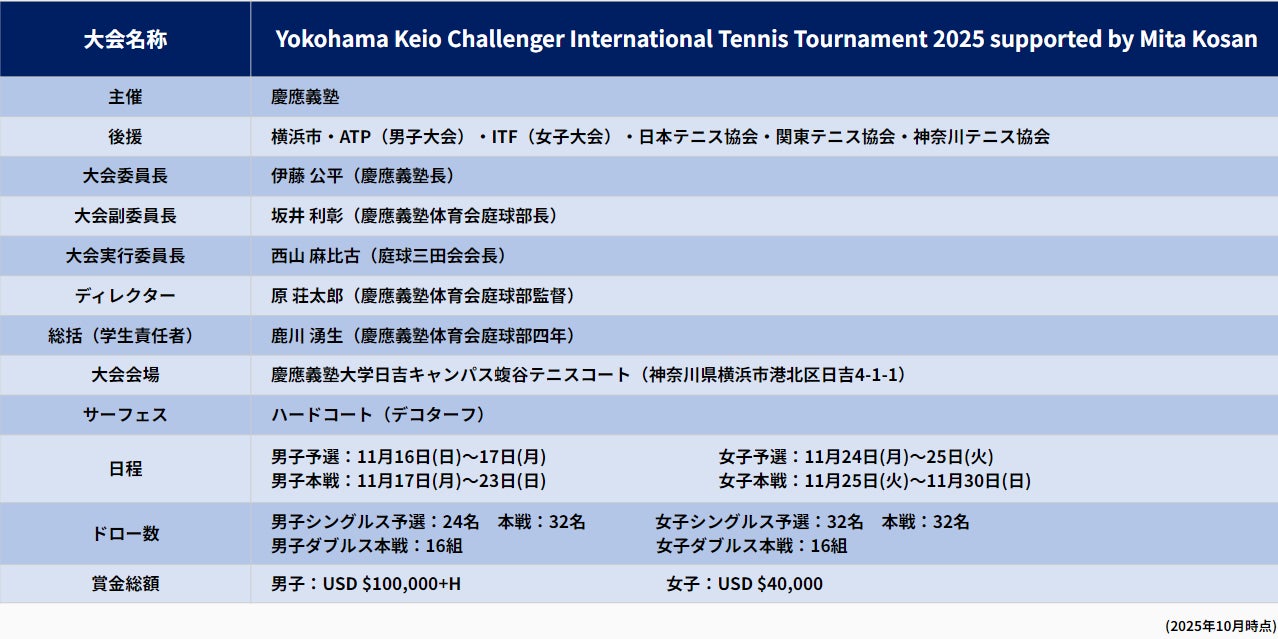 横浜慶應チャレンジャー2025 supported by 三田興産 大会概要ATPチャレンジャー大会(男子大会)とITFサーキット(女子大会)を2週連続で開催する国際テニス大会です。男子大会は、男子国際テニスツアー公式戦(ATP)に属する大会で、世界ランキング70位から400位の選手、将来有望な選手が多数出場予定です。女子大会は、国際テニス連盟(ITF)主催の大会であり、世界女子テニスツアー公式戦(WTA)への登竜門となっています。