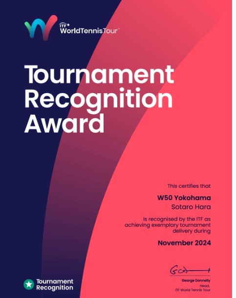 運営品質の基準も厳しくなる中で、本大会での取り組みが評価され、昨年度大会は国際テニス連盟による「Tournament Recognition Programme – Standards Award」を受賞しました。アジア圏では5大会のみが選ばれた名誉なものであり、模範的な大会として選出されました。