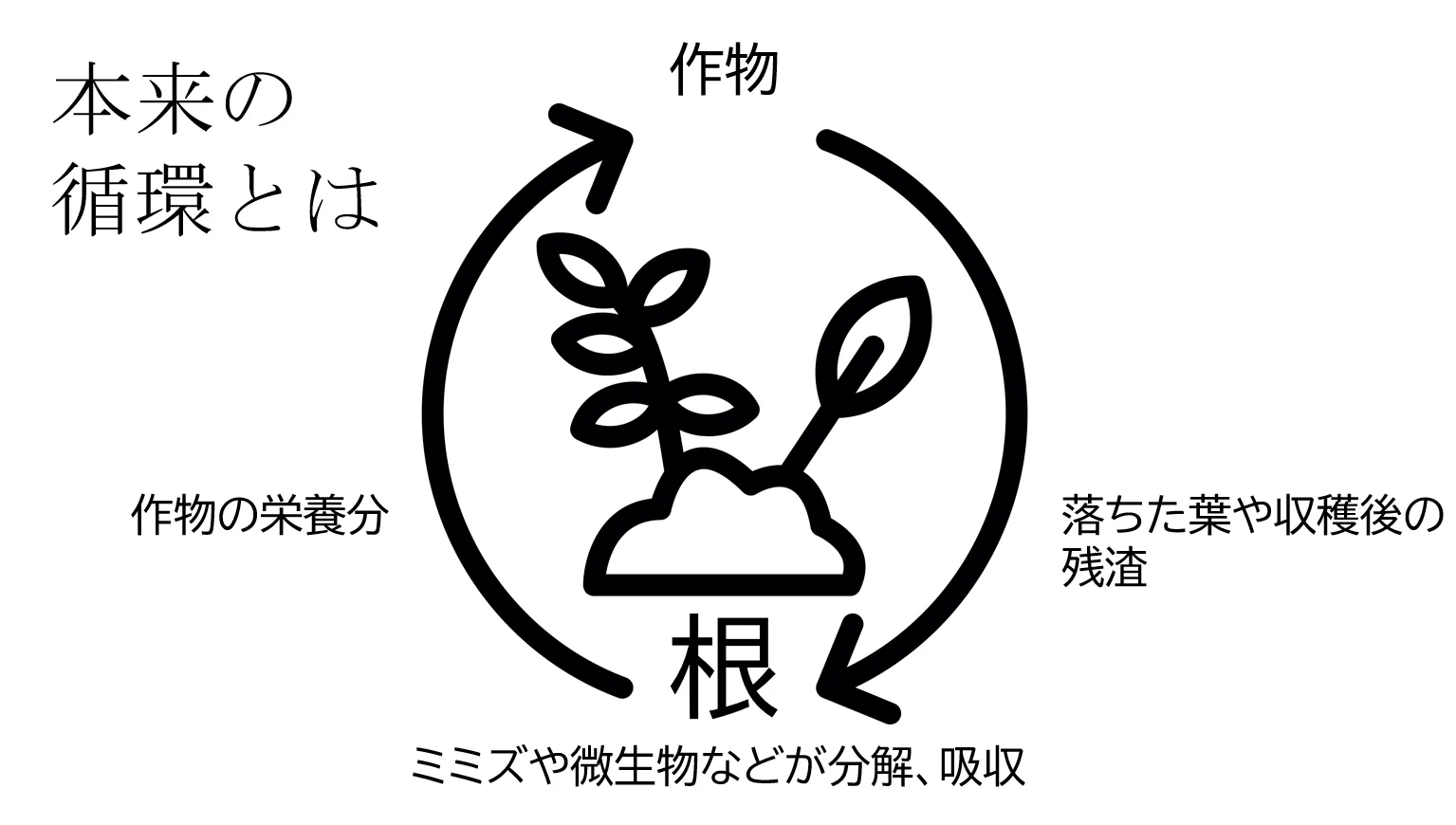 枯れ葉、動物の遺骸、植物の残渣…。これらを微生物が分解し土に還す——この「循環」があるからこそ、土は肥沃になります。