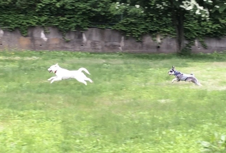 突然、嬉しそうに走り出し、先住犬であるシュナウザーと、自然に遊び始めました。