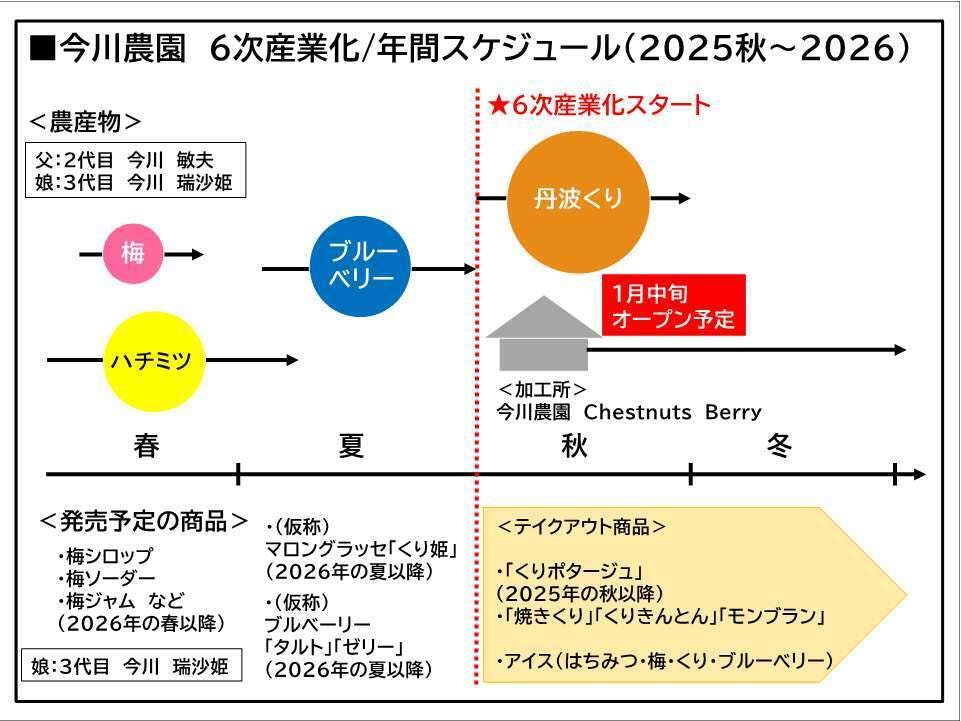 そして、当農園はこの度6次産業化の新たな取り組みとして、自宅敷地内にカフェ「Chestnuts Berry(チェスナッツ ベリー)」をオープンいたします。京丹波の恵みを余すことなく届けたいという思いから誕生し、環境への配慮と食の安心安全を両立した、持続可能な取組みとなります。このカフェでは、当農園で生産した農作物の加工品を製造・販売する予定です。