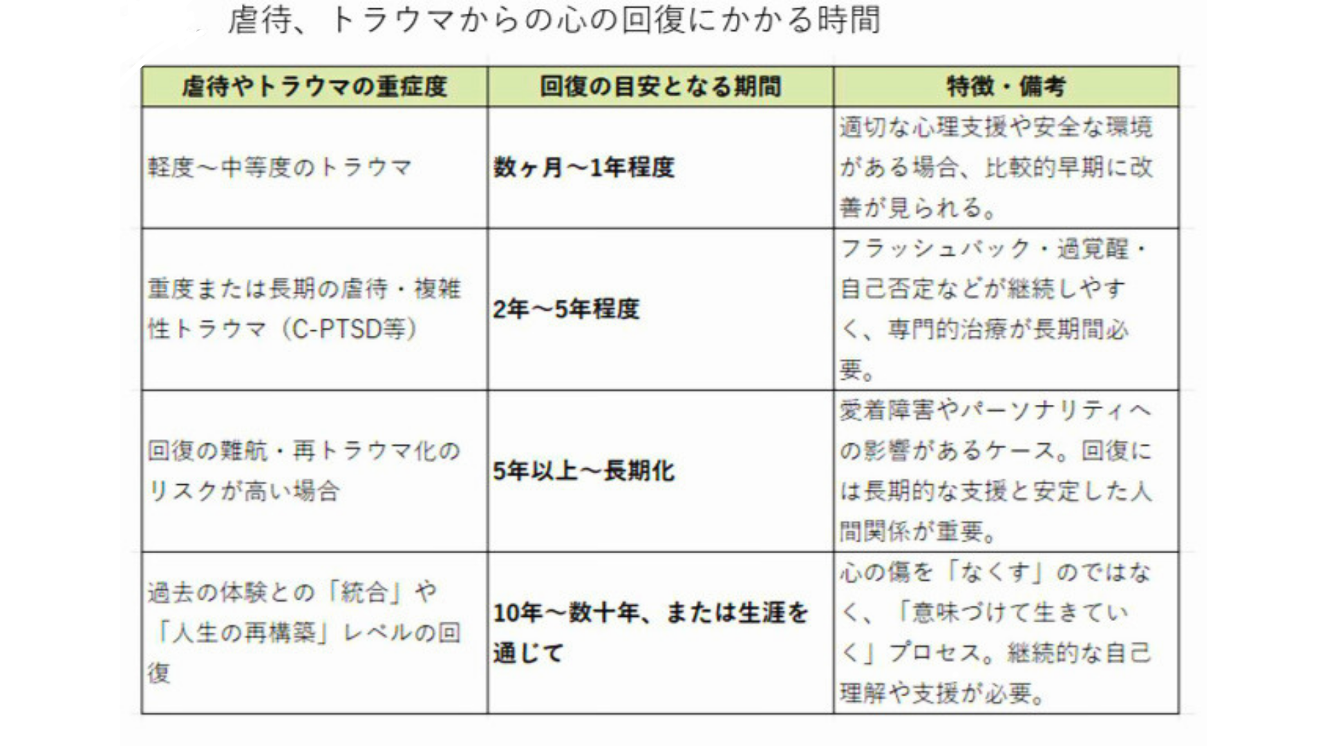 虐待の背景は複合的で、リカバリーには長年要するものの、心のケアが充分ではありません。また、日本は制度間に狭間があり機関連携も充分ではなく、セーフティネットに抜け落ちが生じています。また、メンタルヘルス全般に対する、市民レベルの理解も進んでいません。