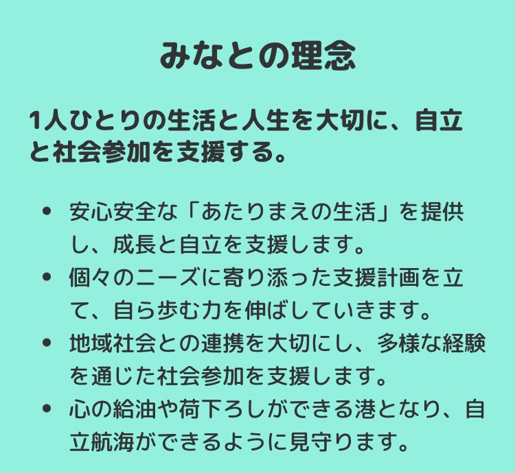 [みなと]の名前は、若者が社会という海原へ漕ぎ出せる“港”になりたいという思いからです。命をつなぎ、各々の専門性を土台に準備を整え、関係機関と地域の方々と力を合わせて彼らの船出を応援します。そして、困った時には戻ってこられる、そんな場所を目指しています。