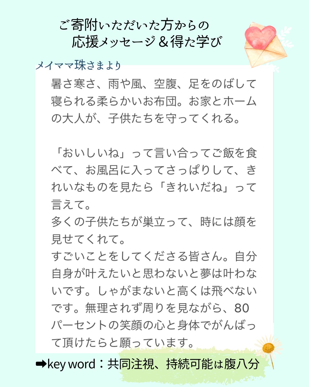 「人はどこに生まれついても、どれも同じ大切な命」。彼らの命が繋がり、頼れる大人や仲間ができ、「人は信じるに足る存在である」と、いつの日か思えますように。そのための応援者づくりを、地域全体で取り組めたらと思うのです。