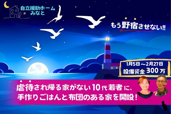 2026/01/05 01:26本日よりクラウドファンディング始まりました!! この寒空の下、雨風しのげない公園や橋の下で、「今日を生きるか…」と迷わざるを得ない若者が、この京都・大阪・滋賀にもいます。 京都市内だけでも、虐待認定を受ける15〜20歳の若者は年間220人(2024年度)。児童相談所や警察に繋げてもらえずに苦悩したままの若者は、はたしてこの何倍でしょうか。 京都市内の自立援助ホームの定員総数は僅か44人に留まり、児童養護施設を含めても受け皿が圧倒的に不足しています。 私たちは京都市中京区(西院)で2026年6月開設に向け、京都市の認可申請に間に合わせるべく、設備費を最低300万がどうしても必要です。 若者の命と人生が繋がるHomeを、私たちと一緒に創っていただけないでしょうか。どうか、あなたのお力をお貸しください。自立援助ホームみなと(一般社団法人みなと)スタッフ一同 もっと見る