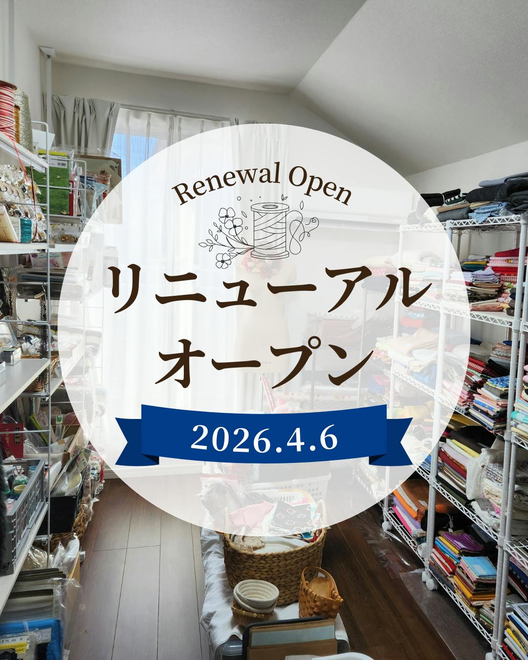 2026/03/01 23:22リニューアルオープン日決定予定より大幅に遅れてしまいましたが自宅で行っていたリユース手芸店の移転オープン日が決定しました!!【初日オープン】2026.4.6(月) 10:00~16:00イベント出店や、出張ミシン教室等イレギュラーでのお休みの日もありますが月曜日~木曜日 + 第3土曜日でお店をオープンします資材の販売だけでなく、・ミシン交流会・黙々作業会・教室/ミシンワークショップ 等などハンドメイド愛好家が楽しく集まり、繋がるきかっけになる場所作りを目指します六畳一間でのお店運営この小さなお店空間で、沢山の資材を楽しく、沢山の人に、様々な形でお届けします!新店舗での資材詰め放題にてご支援いただいた方には、メールで別途告知させていただきますので店舗オープンの時間帯にご来店いただき、お買い物をお楽しみくださいその他、お教室や 生地セットをご購入でのご支援いた方にも順次準備状況を共有させていただきますお時間がかかってしまい申し訳ございません引き続きよろしくお願いいたします もっと見るご支援いただき、有難うございました!