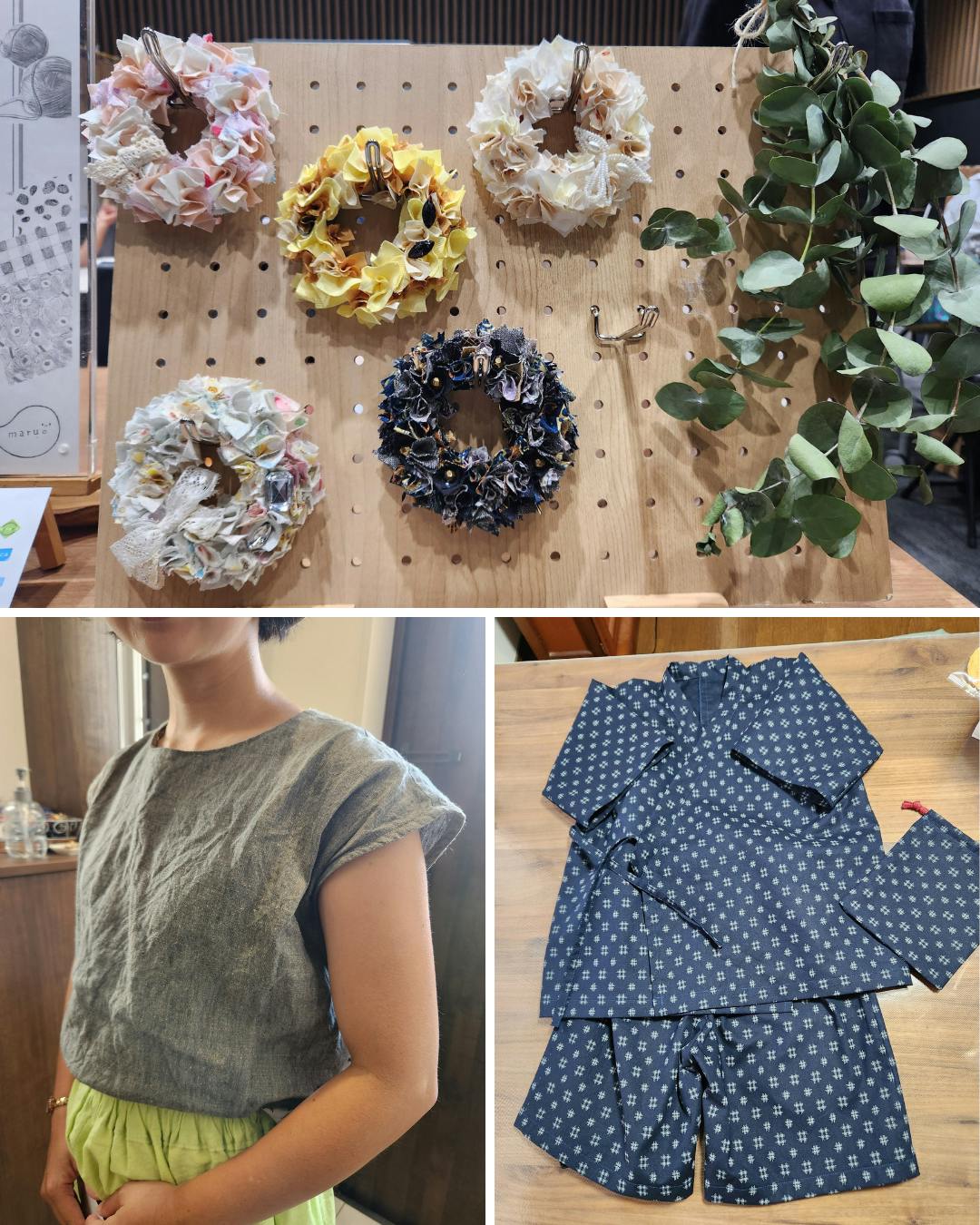 リユース布で作られた作品たち。大きな布はオリジナルのお洋服に