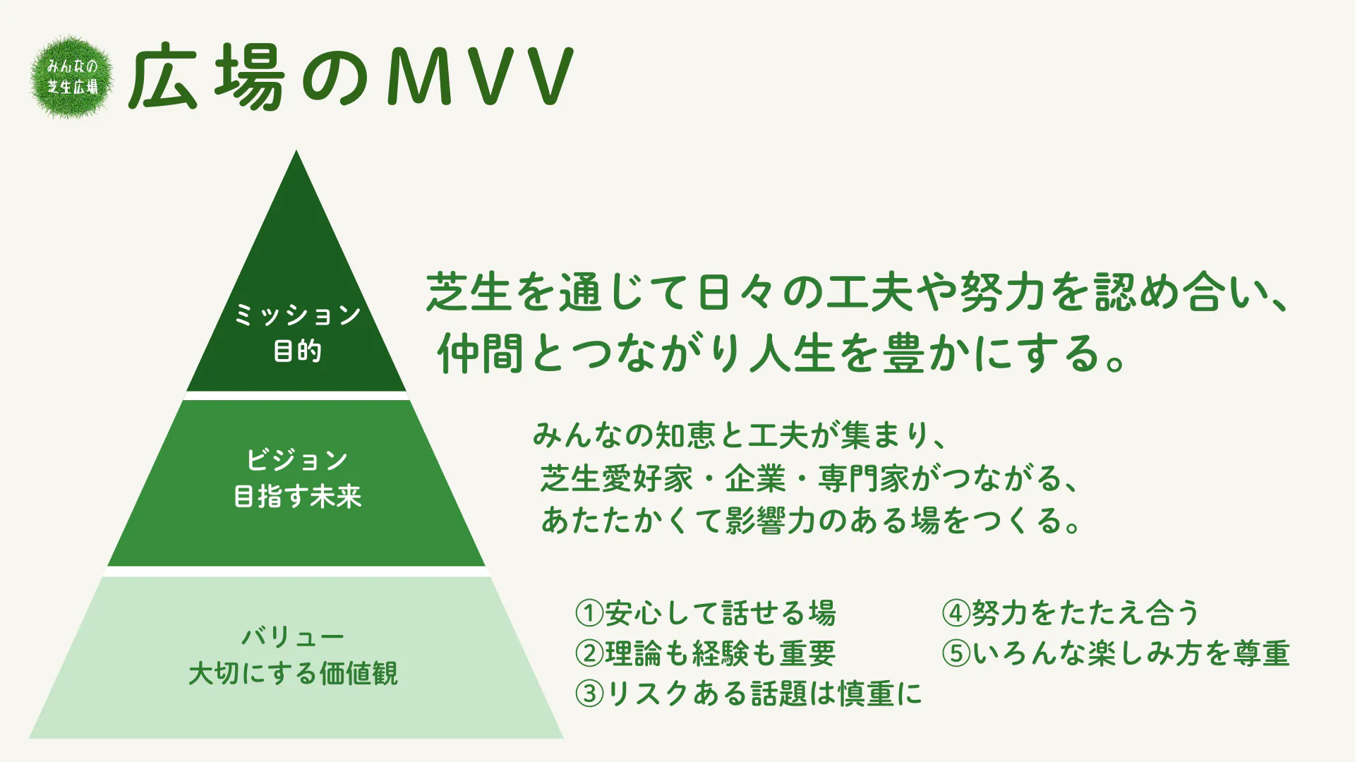 みんなの芝生広場の想い(ミッション・ビジョン・バリュー)