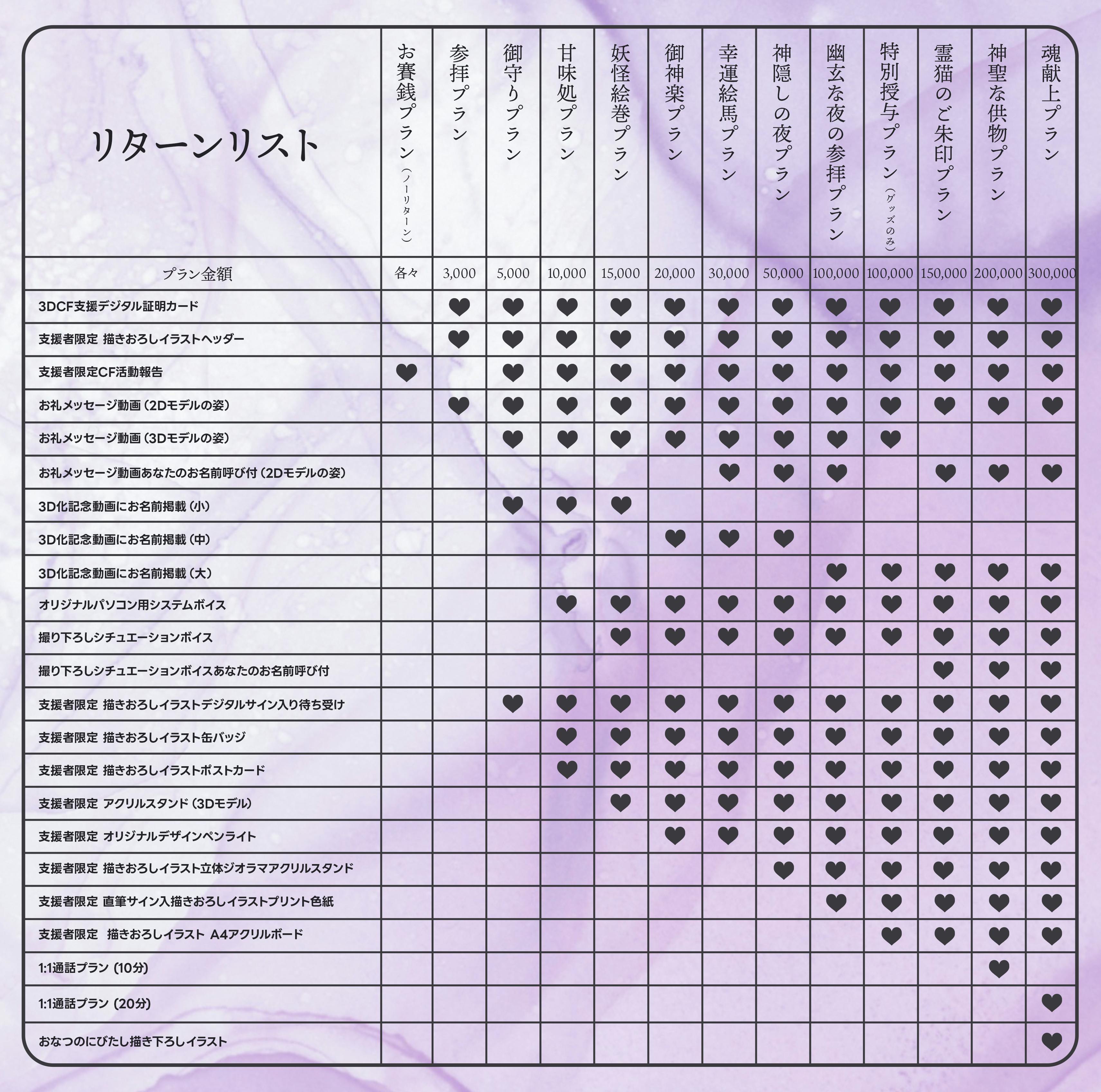 おなつのにびたし3DCF支援デジタル証明カード/支援者限定描き下ろしイラストヘッダー/支援者限定CF活動報告/お礼メッセージ動画(2Dモデルの姿)/お礼メッセージ動画(3Dモデルの姿)/あなたのお名前呼び(Live2Dの姿)お礼メッセージ動画/3D化記念動画にお名前掲載(中)/おなつのにびたしオリジナルパソコン用システムボイス/支援者限定撮り下ろしシチュエーションボイス/支援者限定描き下ろしイラストデジタルサイン入り待ち受け/支援者限定描きおろしイラスト缶バッジ/支援者限定描きおろしイラストポストカード/支援者限定アクリルスタンド(3Dモデル)/支援者限定オリジナルデザインペンライト