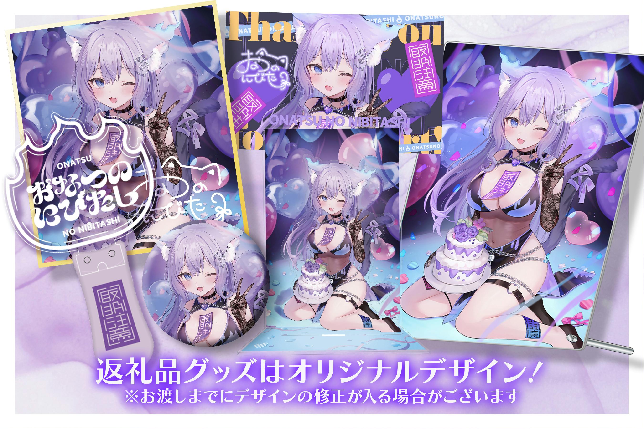 おなつのにびたし3DCF支援デジタル証明カード/支援者限定描き下ろしイラストヘッダー/支援者限定CF活動報告/お礼メッセージ動画(2Dモデルの姿)/お礼メッセージ動画(3Dモデルの姿)/おなつのにびたしオリジナルパソコン用システムボイス/支援者限定撮り下ろしシチュエーションボイス/支援者限定描き下ろしイラストデジタルサイン入り待ち受け/支援者限定描きおろしイラスト缶バッジ/支援者限定描きおろしイラストポストカード/支援者限定アクリルスタンド(3Dモデル)