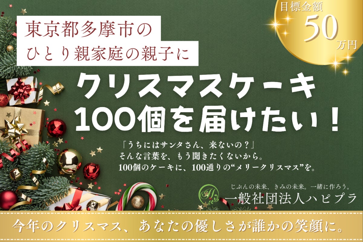 2025/12/15 22:24いよいよ本クラウドファンディングも、残り1時間となりました。 ここまでご支援・応援・シェアをしてくださった皆さま、本当にありがとうございます。皆さま一人ひとりの想いが、この挑戦をここまで支えてくださいました。本プロジェクトは、ひとり親家庭の子どもたちにクリスマスケーキを届け、と感じてもらう時間をつくりたいという思いから始まりました。その想いは、今も変わらず、この最後の1時間にも込められています。正直に言うと、まだ目標達成には届いていません。それでも、最後の最後まで諦めず、できる限り多くの子どもたちに笑顔を届けたいと考えています。もし「いいな」「応援したい」と感じていただけたら、最後のご支援、そしてシェアという形での応援が大きな力になります。残りわずかな時間ですが、この1時間が、子どもたちの心に残るクリスマスにつながることを信じて。最後まで、どうぞよろしくお願いいたします。一般社団法人ハピプラ 役員/社員/インターン研修社員一同 もっと見る★あと3日★ 今、足りていない支援はただの金額でも、ただの物資でもなくて、「あなたが気にかけている」という小さな灯りです。