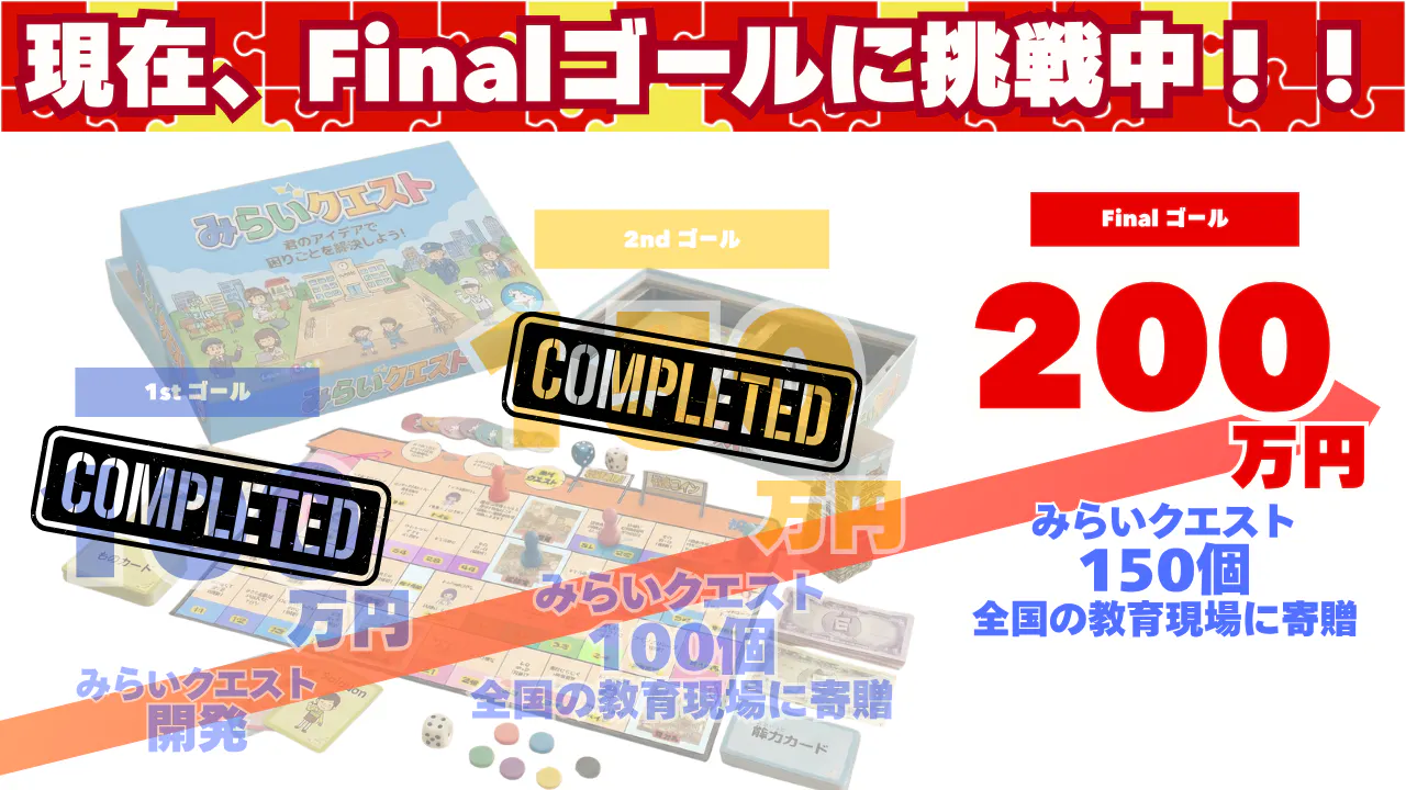 Finalゴールの達成では、僕たちのボードゲーム『みらいクエスト』150個を全国の教育現場に寄贈します!