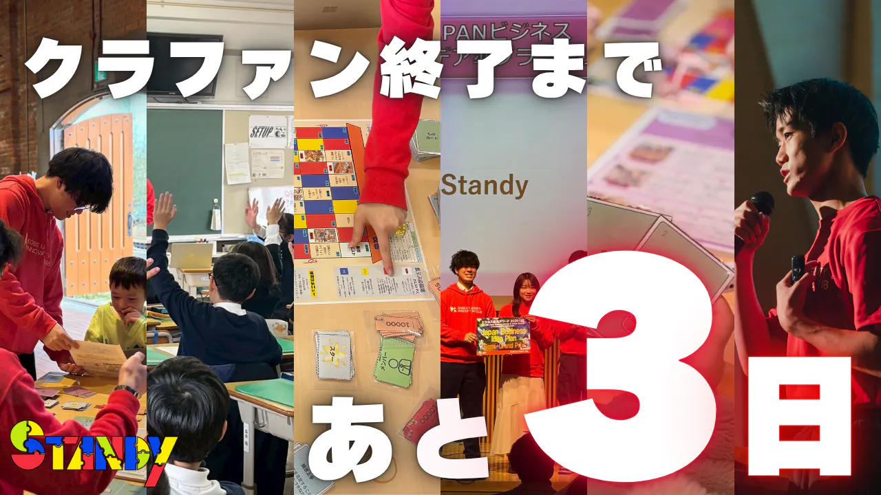 2026/03/28 12:00いつも温かいご支援と応援をいただき、本当にありがとうございます!神戸大学起業部Standyです!クラウドファンディング終了まで、ついに残り3日となりました。現在、私たちは2ndゴールとして「150万円の達成、そして、全国100の学校にボードゲームを寄贈する」という目標を掲げています。子どもたちが遊びながらアントレプレナーシップ(起業家精神)に触れ、自分の未来を切り拓くきっかけを掴める体験を全国100の教育現場に届けたい、そのための挑戦です現在の状況セカンドゴール達成まで、あと「20万円」です!2ndゴール達成まで、あと202,000円。ここまで大変長い道のりでしたが、皆様お一人おひとりのご支援があったからこそ辿り着けました。本当に感謝しかありません!皆様へ最後のお願いあと3日間、どうか最後の一押しをいただけないでしょうか。まだ支援を迷われている方へ皆様の支援が、ダイレクトに「全国の学校への寄贈」につながります。ぜひ、子どもたちの未来を作る仲間に加わっていただけたら嬉しいです!すでにご支援いただいた皆様へもしよろしければ、SNSや周囲の方へ「あと3日だって!」とこのURLをシェアしていただけると、大変嬉しいです!https://camp-fire.jp/projects/897429最後の1秒まで、私たちは全力で走り抜けます。どうか、100施設への寄贈を実現させるために、最後まで伴走をお願いいたします! もっと見る