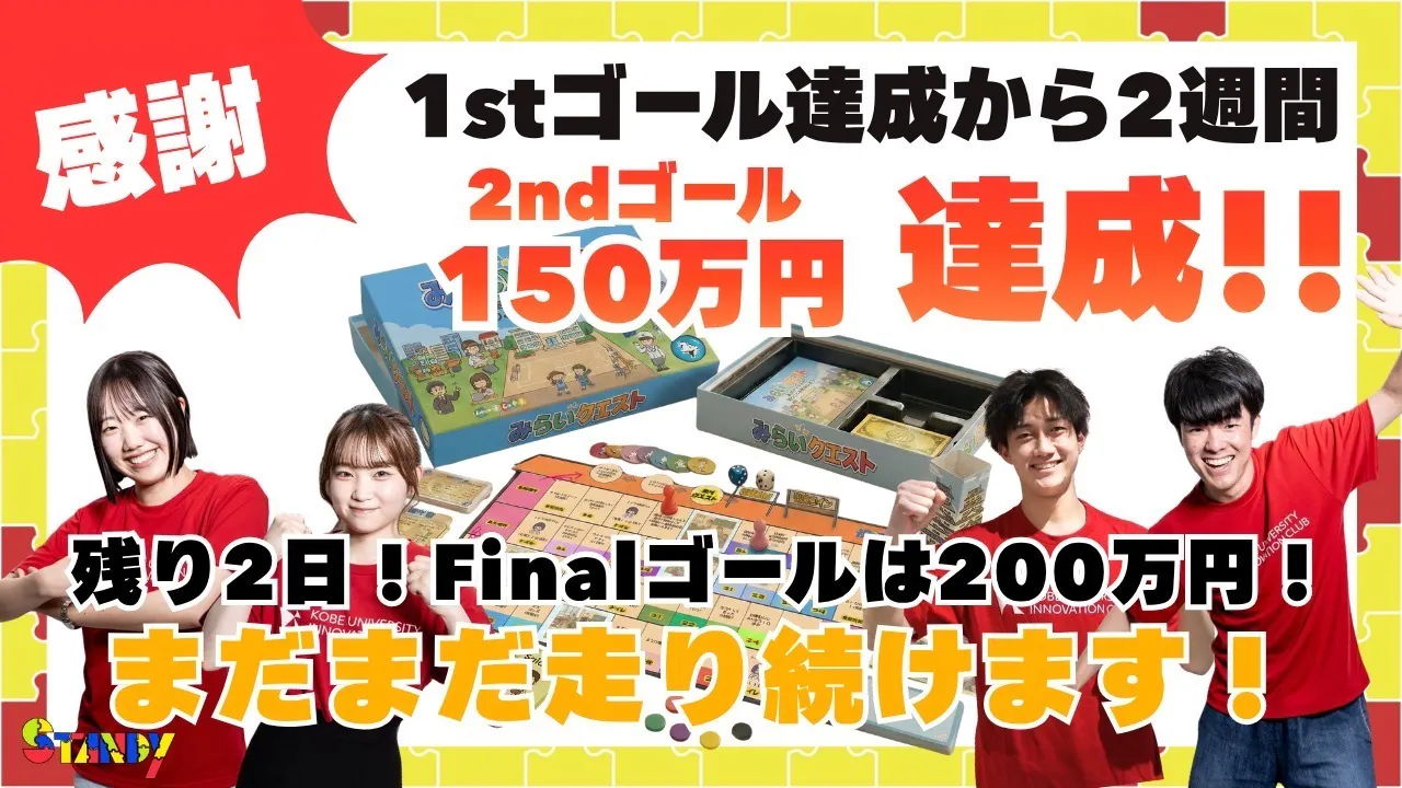 2026/03/29 12:10いつも温かいご支援と応援をいただき、本当にありがとうございます!神戸大学起業部Standyです。皆様に、最高のご報告があります。クラウドファンディング終了まで残り2日というところで、ついに……2ndゴールである「150万円」を達成することができました!!!1stゴール達成からわずか2週間。ここまでの高い壁を乗り越えられたのは、ご支援、ご拡散、そして心温まる応援のお言葉をくださった皆様、一人ひとりの応援のおかげです!チーム一同、感謝の気持ちでいっぱいです。本当にありがとうございます! 次なる挑戦:Finalゴール「200万円」へ2ndゴールの達成により、全国100の教育現場へ『みらいクエスト』を届けることが確定しました!そして残り2日間、私たちはFinalゴールとして掲げていた「200万円」の達成に向けて最後の挑戦をします!この目標を達成し、寄贈数をさらに増やし、「合計150個」のボードゲームを全国の子どもたちに届けます!「一人でも多くの子どもたちが、遊びながら自分の未来を切り拓くきっかけを掴んでほしい」その想いを日本中に広げるため、最後まで全力で走り抜けます!皆様へ最後のお願い泣いても笑っても、泣いてもあと2日です!ここまで皆様から繋いでいただいたバトンを、最高の形でゴールへ届けます! まだ支援を迷われている方へ皆様の最後の一押しが、あと50校の子どもたちに僕たちのボードゲームを届ける大きな力になります!ぜひ、私たちの仲間に加わっていただけたら嬉しいです!すでにご支援いただいた皆様「Standyが2ndゴールを達成して、Finalゴールに挑んでるよ!」と、SNSや周囲の方へ最後のリポスト・シェアで応援いただけると、これ以上ない励みになります!URLはこちら:https://camp-fire.jp/projects/897429改めて2ndゴールの達成、ありがとうございました!最後の1秒まで、全力で頑張ります!!神戸大学起業部Standy 一同 もっと見る