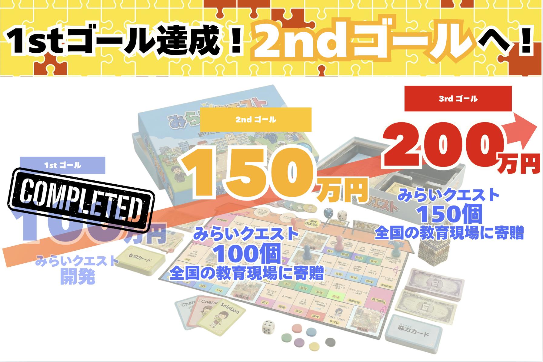 「みらいクエスト」100個を全国の教育現場に寄贈!150万円に到達することで、金型を用いた本格的な量産体制を確立します。そして、全国の小学校・学童・教育施設などへ、このゲームを無償で届けます!