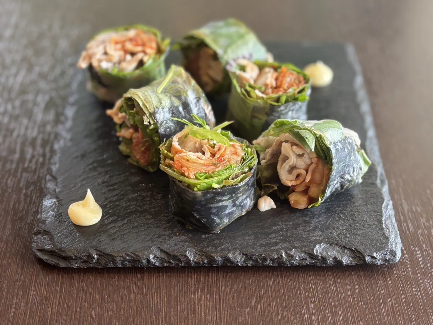 和風のキムチと豚肉をライスペーパーで巻いてます。