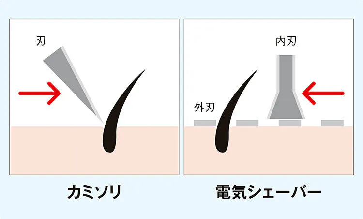一方、電気シェーバーは外刃でヒゲを押さえ込み、内刃でカットする――いわば“ハサミのような構造”。肌への負担は少ない反面、ヒゲの根元までは届かず、わずかに剃り残りが出やすいのが特徴です。同じ「剃る」でも、構造の違いが仕上がりの差を生み出します。
