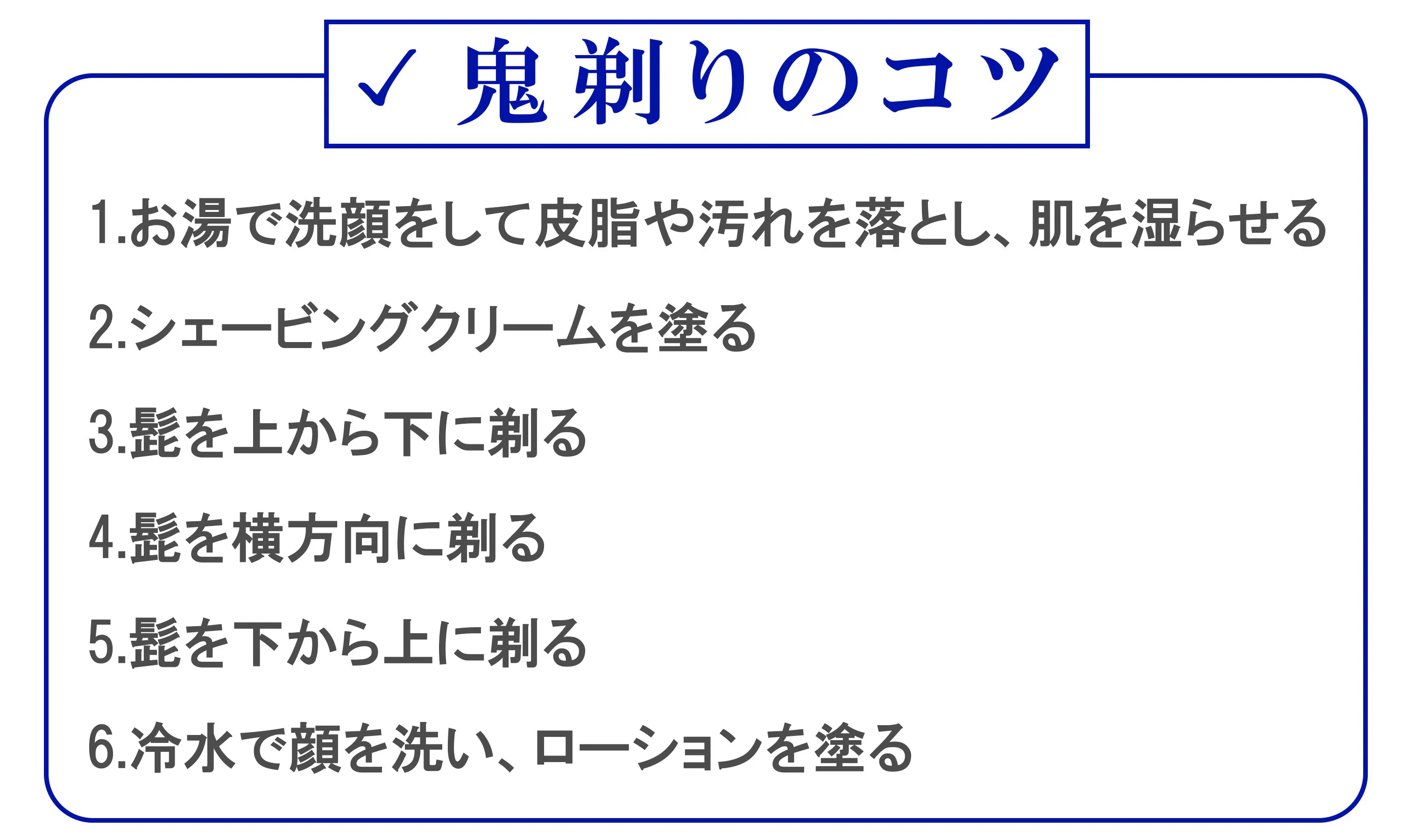 A. 電気シェーバーは外刃と内刃の構造でヒゲを“挟み切る”仕組みですが、鬼剃りは刃がヒゲの根元に直接届くため、より深い剃り上がりを実現します。朝のひと剃りで、夕方まで青ヒゲが目立ちにくくなります。
