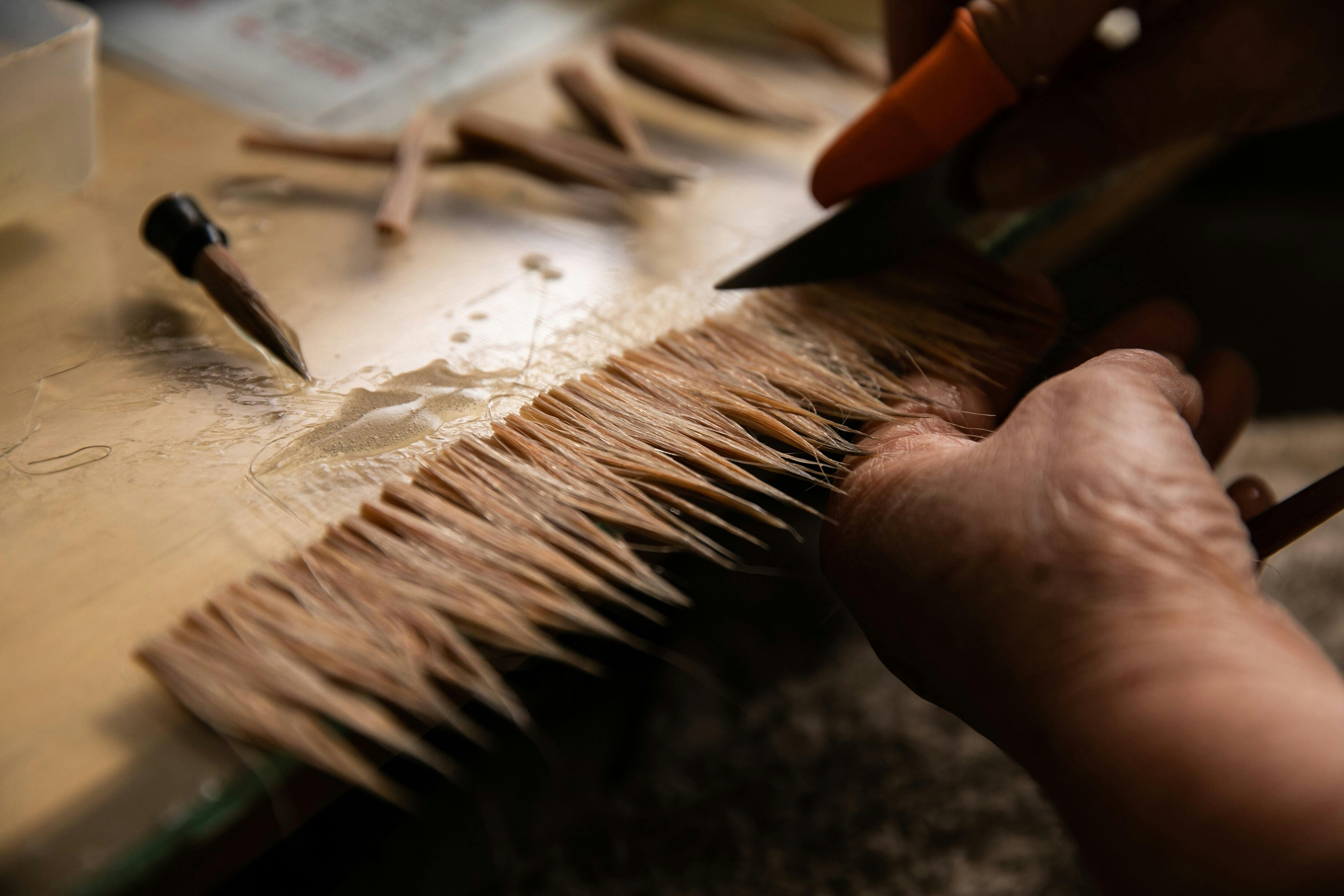当社は150年以上筆づくりに携わり「毛先を切らない」伝統技法と丁寧な工程を守り続けています。書面用から化粧筆・洗顔ブラシまで技を広げ、サステナブルな視点で新たな商品開発にも取り組んでいます。