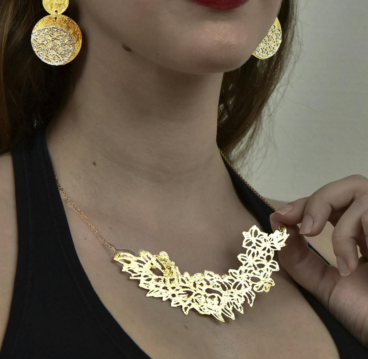 切り絵の透かしと紙、漆、箔を重ねた独自素材で特許を取得した KIRIEBIJOU。紙と透彫技術を熟知した切り絵アーティストが開発した、水に強い特殊紙をベースに、K24純金箔を用いて生まれた新感覚のジュエリーです。