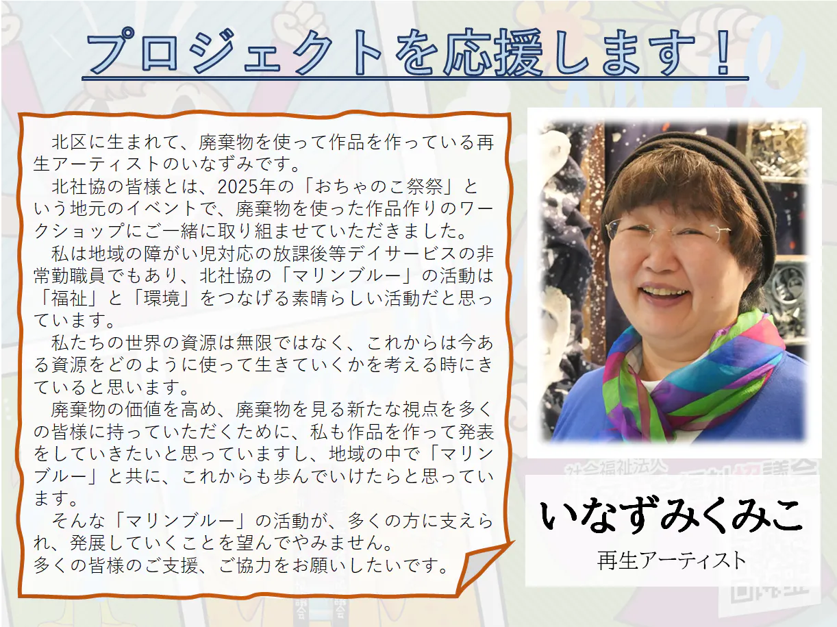 2025/12/24 17:00廃棄物を素材として作品制作に取り組まれているいなずみさんは、地域に根ざしたアーティストとして、環境問題と表現活動を結びつけた実践を続けてこられました。2025年6月に開催された「おちゃのこ祭祭」では、北社協とともに、廃棄物を使った作品づくりのワークショップに取り組み、来場者と一緒に“捨てられるものの価値”を考える場をつくってくださいました。また、いなずみさんご自身は、障がい児対応の放課後等デイサービスに関わる立場でもあり、日頃から福祉の現場に身を置いて活動されています。そうした経験から、「マリンブルー」の取り組みについて、福祉と環境をつなぐ意義深い活動として共感と期待の言葉を寄せてくださいました。限りある資源をどのように活かし、次の世代につないでいくのか——。廃棄物の価値を見つめ直す視点と、地域の中で人が役割を持ち、共に歩んでいくという「マリンブルー」の理念は、いなずみさんの表現活動とも深く重なっています。今回いただいた応援メッセージは、私たちの活動の方向性をあらためて確認し、地域とともに歩み続ける大きな励みとなりました。多くの方の支えに感謝しながら、「マリンブルー」はこれからも、環境と福祉をつなぐ実践を積み重ねていきます。>>> 以下、いなずみくみこさんからの応援メッセージです <<< 北区に生まれて、廃棄物を使って作品を作っている再生アーティストのいなずみです。 北社協の皆様とは、2025年の「おちゃのこ祭祭」という地元のイベントで、廃棄物を使った作品作りのワークショップにご一緒に取り組ませていただきました。 私は地域の障がい児対応の放課後等デイサービスの非常勤職員でもあり、北社協の「マリンブルー」の活動は「福祉」と「環境」をつなげる素晴らしい活動だと思っています。 私たちの世界の資源は無限ではなく、これからは今ある資源をどのように使って生きていくかを考える時にきていると思います。 廃棄物の価値を高め、廃棄物を見る新たな視点を多くの皆様に持っていただくために、私も作品を作って発表をしていきたいと思っていますし、地域の中で「マリンブルー」と共に、これからも歩んでいけたらと思っています。 そんな「マリンブルー」の活動が、多くの方に支えられ、発展していくことを望んでやみません。 多くの皆様のご支援、ご協力をお願いしたいです。 もっと見る