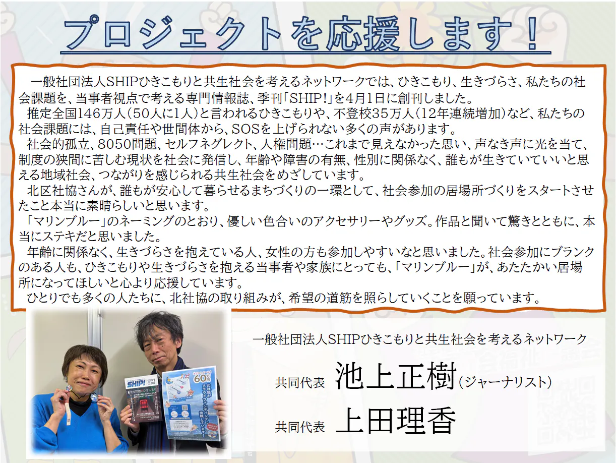 2025/12/25 17:37一般社団法人SHIPひきこもりと共生社会を考えるネットワークの共同代表のお2人:池上正樹様(ジャーナリスト)と上田理香様より応援メッセージが届きました。 マリンブルーの趣旨にご賛同いただき、長年ひきこもりの課題と向き合ってこられたお立場から、本取り組みへの温かいエールをお寄せいただきました。 ひきこもり状態にある方々の社会参加や地域とのつながりを大切にする本取り組みへの期待と励ましのお言葉に励まされ、私たちも改めて、マリンブルーが目指す「誰ひとり取り残さない地域づくり」への想いを強くしています。>>池上様、上田様からの応援メッセージは以下のとおりです<< 一般社団法人SHIPひきこもりと共生社会を考えるネットワークでは、ひきこもり、生きづらさ、私たちの社会課題を、当事者視点で考える専門情報誌、季刊「SHIP!」を4月1日に創刊しました。 推定全国146万人(50人に1人)と言われるひきこもりや、不登校35万人(12年連続増加)など、私たちの社会課題には、自己責任や世間体から、SOSを上げられない多くの声があります。 社会的孤立、8050問題、セルフネグレクト、人権問題…これまで見えなかった思い、声なき声に光を当て、制度の狭間に苦しむ現状を社会に発信し、年齢や障害の有無、性別に関係なく、誰もが生きていていいと思える地域社会、つながりを感じられる共生社会をめざしています。 北区社協さんが、誰もが安心して暮らせるまちづくりの一環として、社会参加の居場所づくりをスタートさせたこと本当に素晴らしいと思います。 「マリンブルー」のネーミングのとおり、優しい色合いのアクセサリーやグッズ。作品と聞いて驚きとともに、本当にステキだと思いました。 年齢に関係なく、生きづらさを抱えている人、女性の方も参加しやすいなと思いました。社会参加にブランクのある人も、ひきこもりや生きづらさを抱える当事者や家族にとっても、「マリンブルー」が、あたたかい居場所になってほしいと心より応援しています。 ひとりでも多くの人たちに、北社協の取り組みが、希望の道筋を照らしていくことを願っています。 もっと見る