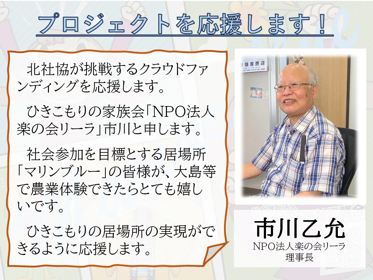 「北社協の挑戦クラウドファンディングを応援します。ひきこもりの家族会『NPO法人楽の会リーラ』の市川と申します。社会参加を目標とする居場所『マリンブルー』の皆様が、大島などで農業体験できたら、とても嬉しいです。ひきこもりの居場所づくりが実現できるように応援します。市川乙允」