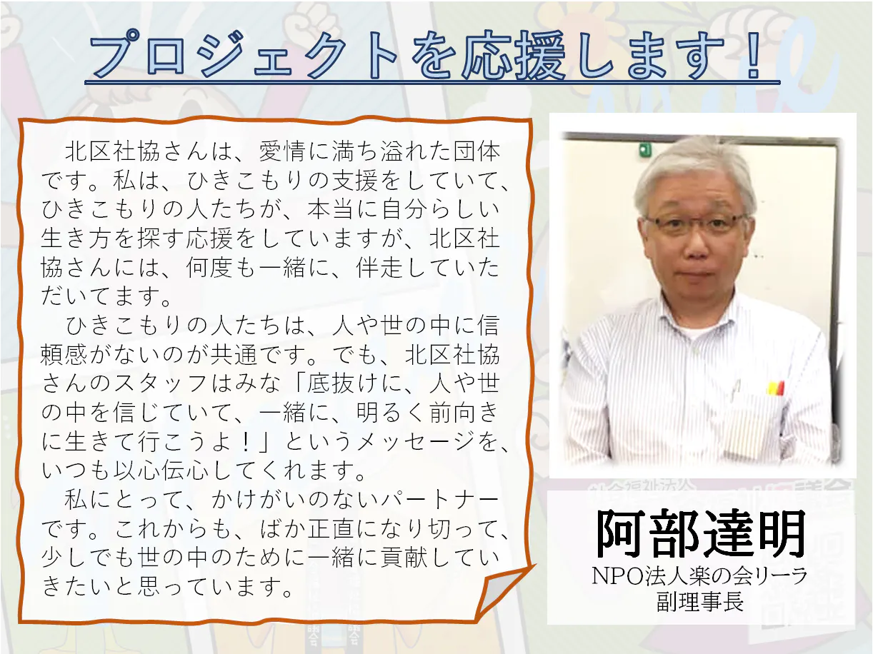 北区社協さんは、愛情に満ち溢れた団体です。 私は、ひきこもりの支援をしていて、ひきこもりの人たちが、本当に自分らしい生き方を探す応援をしていますが、北区社協さんには、何度も一緒に、伴走していただいてます。ひきこもりの人たちは、人や世の中に信頼感がないのが共通です。でも、北区社協さんのスタッフはみな「底抜けに、人や世の中を信じていて、一緒に、明るく前向きに生きて行こうよ!」というメッセージを、いつも以心伝心してくれます。私にとって、かけがいのないパートナーです。これからも、ばか正直になり切って、少しでも世の中のために一緒に貢献していきたいと思っています。 NPO法人楽の会リーラ 副理事長 阿部達明