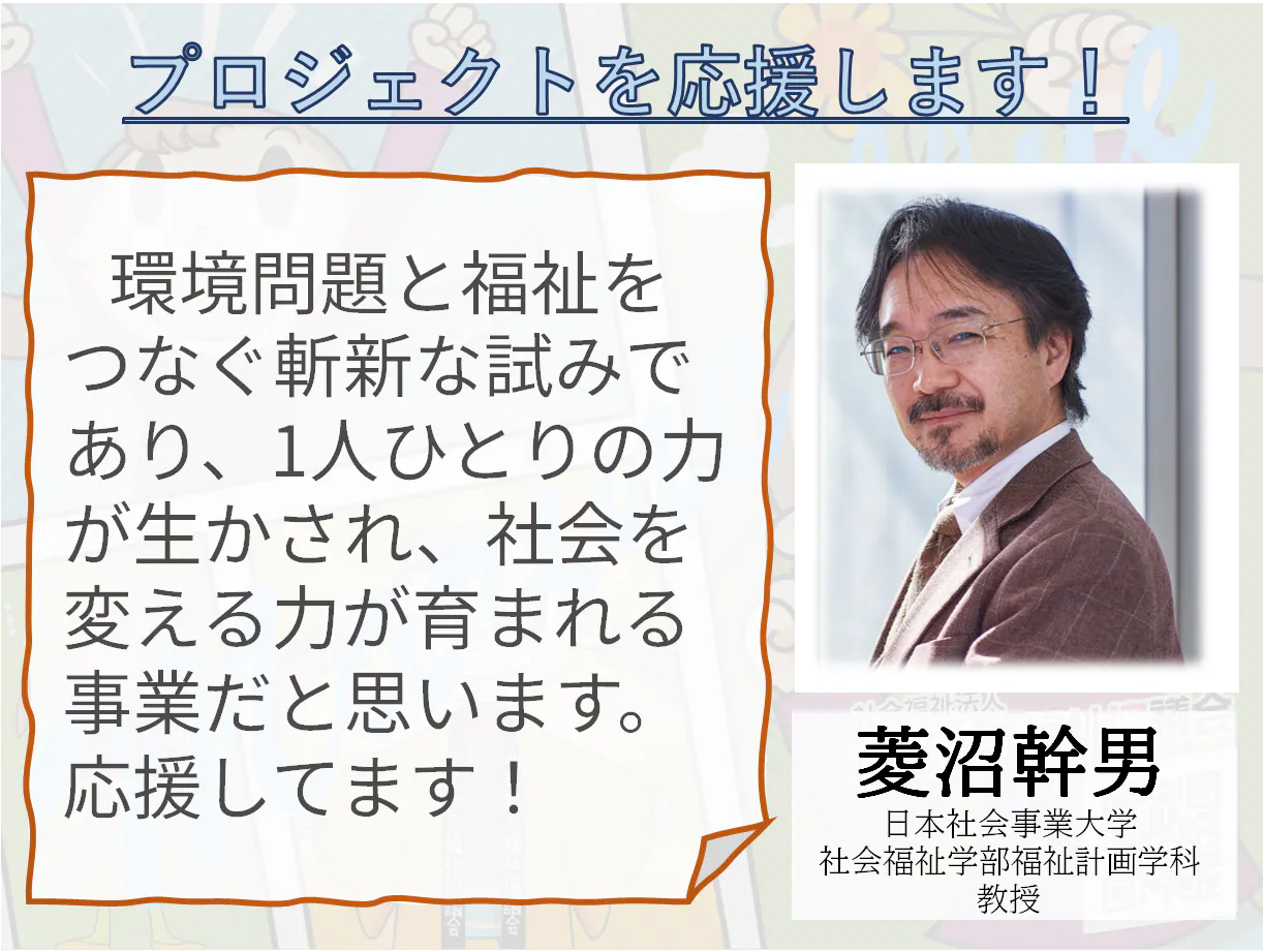 「環境問題と福祉をつなぐ斬新な試みであり、1人ひとりの力が生かされ、社会を変える力が育まれる事業だと思います。応援してます!」