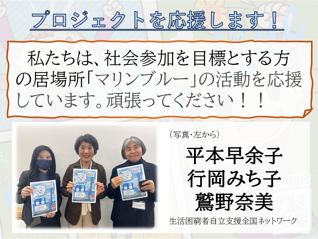 私たちが取り組む、社会参加を目指す方の居場所「マリンブルー」の活動に対し、全国で生活困窮者支援に携わる皆さまから心のこもった励ましの言葉をいただきました。日々、さまざまな困難を抱える方々に寄り添い続けてこられた支援団体の皆さまからの応援は、参加者一人ひとりにとっても、また私たち運営に関わるスタッフにとっても、大きな勇気と支えとなっています。
