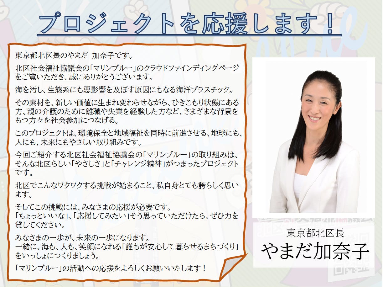 目標金額の50%を達成しました。ご支援ありがとうございます。このたび、北区社会福祉協議会が取り組む「マリンブルー」のクラウドファンディングに対し、東京都北区長・やまだ加奈子様から、温かく力強いメッセージが寄せられました。ぜひ、区長からのメッセージをご覧ください。読み終えた瞬間、「もっとがんばろう」と背中を押してもらえる——そんな励ましに満ちた内容でした。やまだ区長は、海洋プラスチックという大きな環境課題と、ひきこもり状態にある方や離職・失業を経験した方など、多様な背景をもつ人の社会参加支援を結びつけた本プロジェクトについて、「環境保全と地域福祉を同時に前進させる、地球にも、人にも、未来にもやさしい取り組み」と評価くださっています。地域の未来を支えるために、いま必要なこと。その一歩を踏み出した私たちの挑戦に、区長が真っ先にエールを送ってくださいました。区長のそんな想いを胸に、私たちはさらに前へ進みます。北区らしい“やさしさ”と“チャレンジ精神”がつまった本プロジェクト。この挑戦を進めていくためには、みなさまの応援が欠かせません。そして、「いい取り組みだな」と感じていただけたら、どうかお力添えをお願いいたします。>>> 以下、やまだ区長からの応援メッセージ全文 <<<東京都北区長のやまだ 加奈子です。北区社会福祉協議会の「マリンブルー」のクラウドファインディングページをご覧いただき、誠にありがとうございます。海を汚し、生態系にも悪影響を及ぼす原因にもなる海洋プラスチック。その素材を、新しい価値に生まれ変わらせながら、ひきこもり状態にある方、親の介護のために離職や失業を経験した方など、さまざまな背景をもつ方々を社会参加につなげる。このプロジェクトは、環境保全と地域福祉を同時に前進させる、地球にも、人にも、未来にもやさしい取り組みです。今回ご紹介する北区社会福祉協議会の「マリンブルー」の取り組みは、そんな北区らしい「やさしさ」と「チャレンジ精神」がつまったプロジェクトです。北区でこんなワクワクする挑戦が始まること、私自身とても誇らしく思います。そしてこの挑戦には、みなさまの応援が必要です。「ちょっといいな」、「応援してみたい」そう思っていただけたら、ぜひ力を貸してください。みなさまの一歩が、未来の一歩になります。一緒に、海も、人も、笑顔になれる「誰もが安心して暮らせるまちづくり」をいっしょにつくりましょう。 「マリンブルー」の活動への応援をよろしくお願いいたします!東京都北区長 やまだ 加奈子