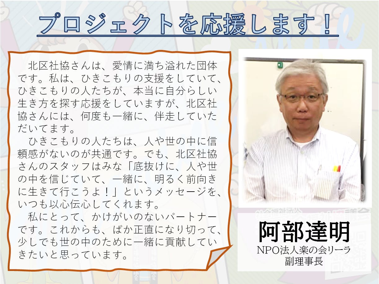 2025/12/02 10:00NPO法人楽の会リーラ 副理事長・阿部達明さまより、心温まる応援メッセージをいただきましたのでご紹介します。阿部さまは、ひきこもり支援の現場で、北区社協と何度も伴走してきた経験から、北区社協の“まっすぐで人を信じる姿勢”を高く評価してくださいました。阿部様からの応援メッセージは以下のとおりです北区社協さんは、愛情に満ち溢れた団体です。 私は、ひきこもりの支援をしていて、ひきこもりの人たちが、本当に自分らしい生き方を探す応援をしていますが、北区社協さんには、何度も一緒に、伴走していただいてます。ひきこもりの人たちは、人や世の中に信頼感がないのが共通です。でも、北区社協さんのスタッフはみな「底抜けに、人や世の中を信じていて、一緒に、明るく前向きに生きて行こうよ!」というメッセージを、いつも以心伝心してくれます。私にとって、かけがいのないパートナーです。これからも、ばか正直になり切って、少しでも世の中のために一緒に貢献していきたいと思っています。 NPO法人楽の会リーラ 副理事長 阿部達明阿部さまからの熱いメッセージをしっかり受け止め、今後も地域の中で、ひとり一人に寄り添い続ける活動を進めてまいります。応援よろしくお願いいたします! もっと見る