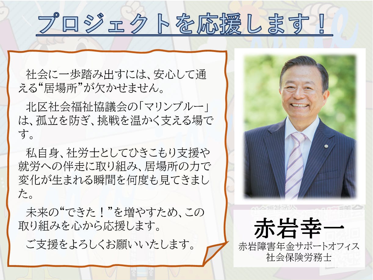 2025/12/03 10:00赤岩障害年金サポートオフィス社会保険労務士・赤岩幸一さまより、力強い応援メッセージをいただきましたのでご紹介します。赤岩さまは、ひきこもり支援や就労への伴走を続ける社労士として、「安心して通える居場所」が人の一歩を大きく支えることを実感されてきたそうです。その視点から、マリンブルーの取り組みへ温かいエールを寄せてくださいました。赤岩幸一様からの応援メッセージは以下のとおりです「社会に一歩踏み出すには、安心して通える“居場所”が欠かせません。北区社会福祉協議会の「マリンブルー」は、孤立を防ぎ、挑戦を温かく支える場です。 私自身、社労士としてひきこもり支援や就労への伴走に取り組み、居場所の力で変化が生まれる瞬間を何度も見てきました。 未来の“できた!”を増やすため、この取り組みを心から応援します。 ご支援をよろしくお願いいたします。」あたたかい応援の言葉を励みに、これからも一歩を踏み出す人を後押しする場づくりを進めてまいります。引き続き、どうぞよろしくお願いいたします。 もっと見る