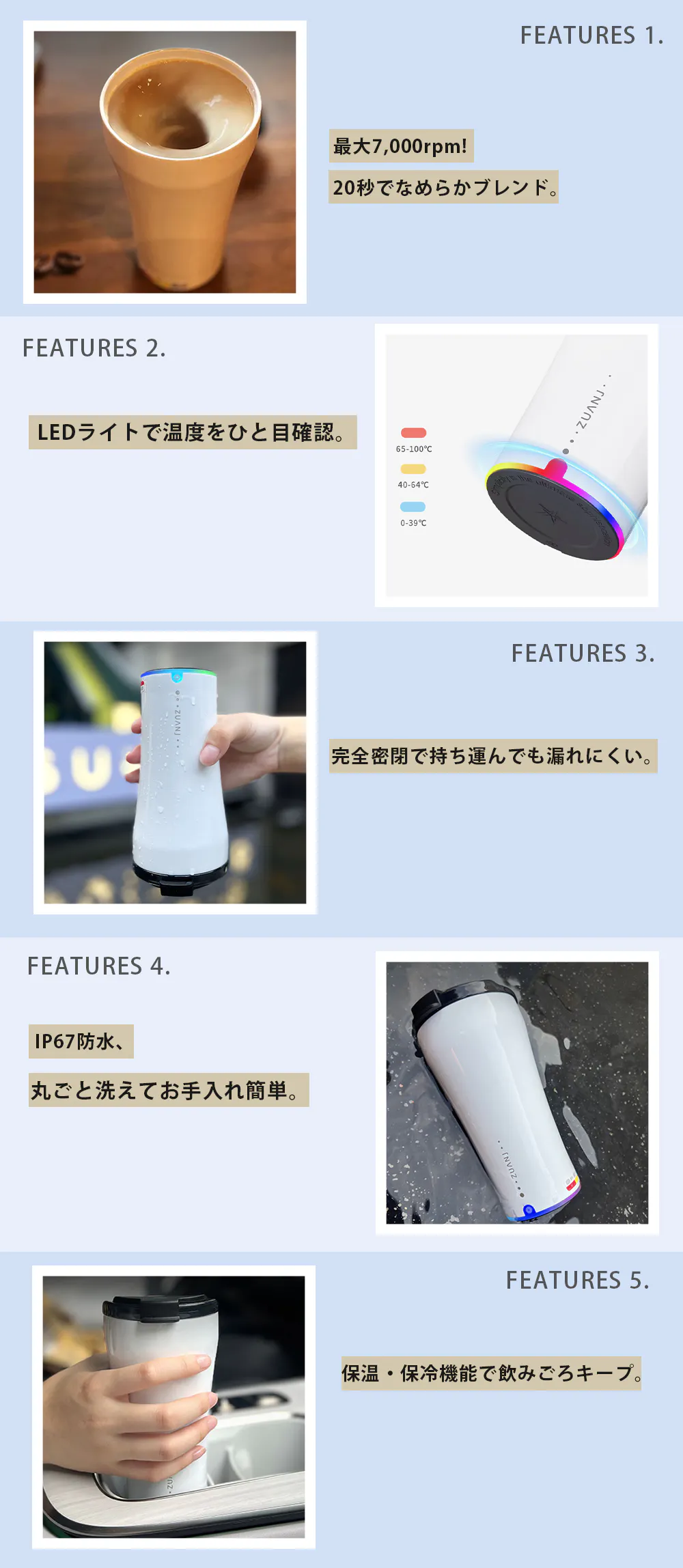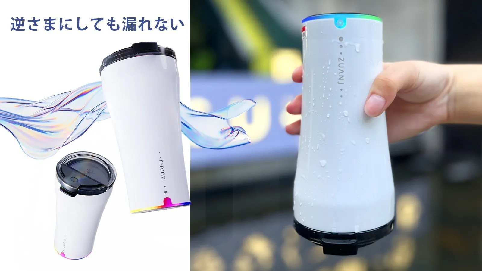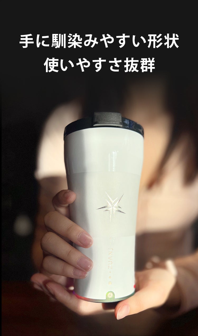市販の従来品はマグカップ型が多い中、本製品は完全密閉のタンブラー型を採用。激しく揺らしても中身が漏れにくく、通勤・通学やアウトドアでも安心して持ち運べます。