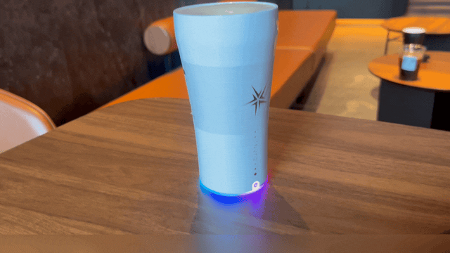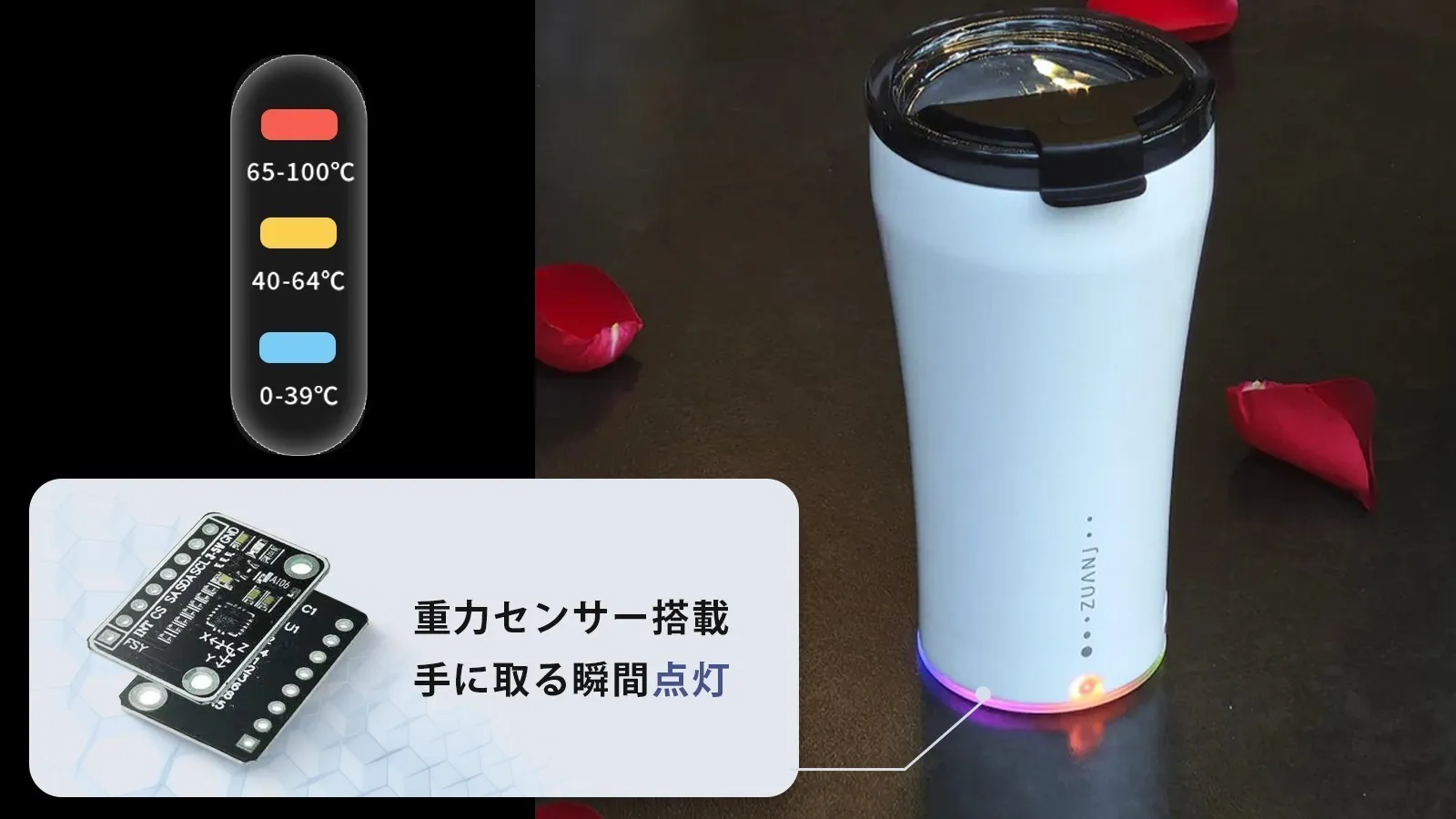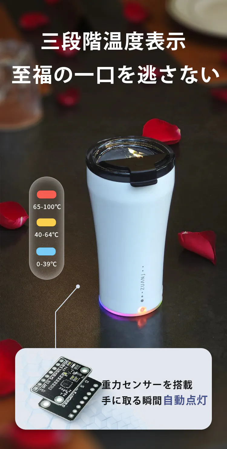 底部には温度センサーと重力センサーを搭載しており、カップを手に取るだけで温度表示が自動で点灯。3段階の温度表示で熱すぎる飲み物によるやけども防げます。