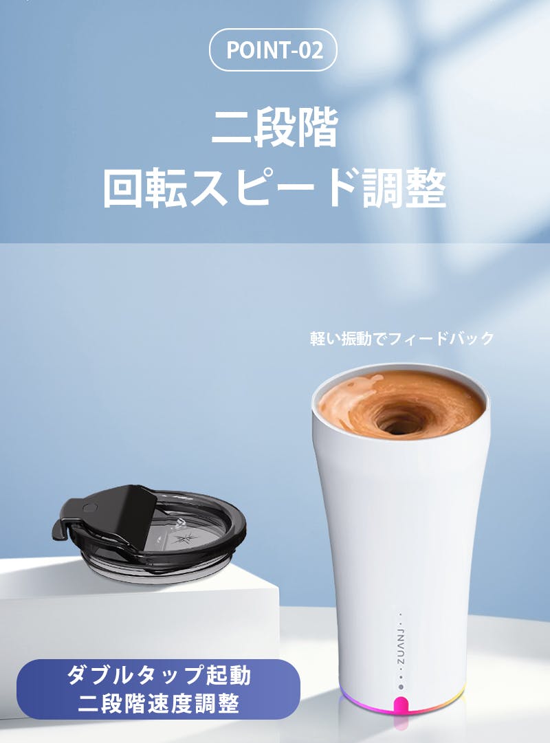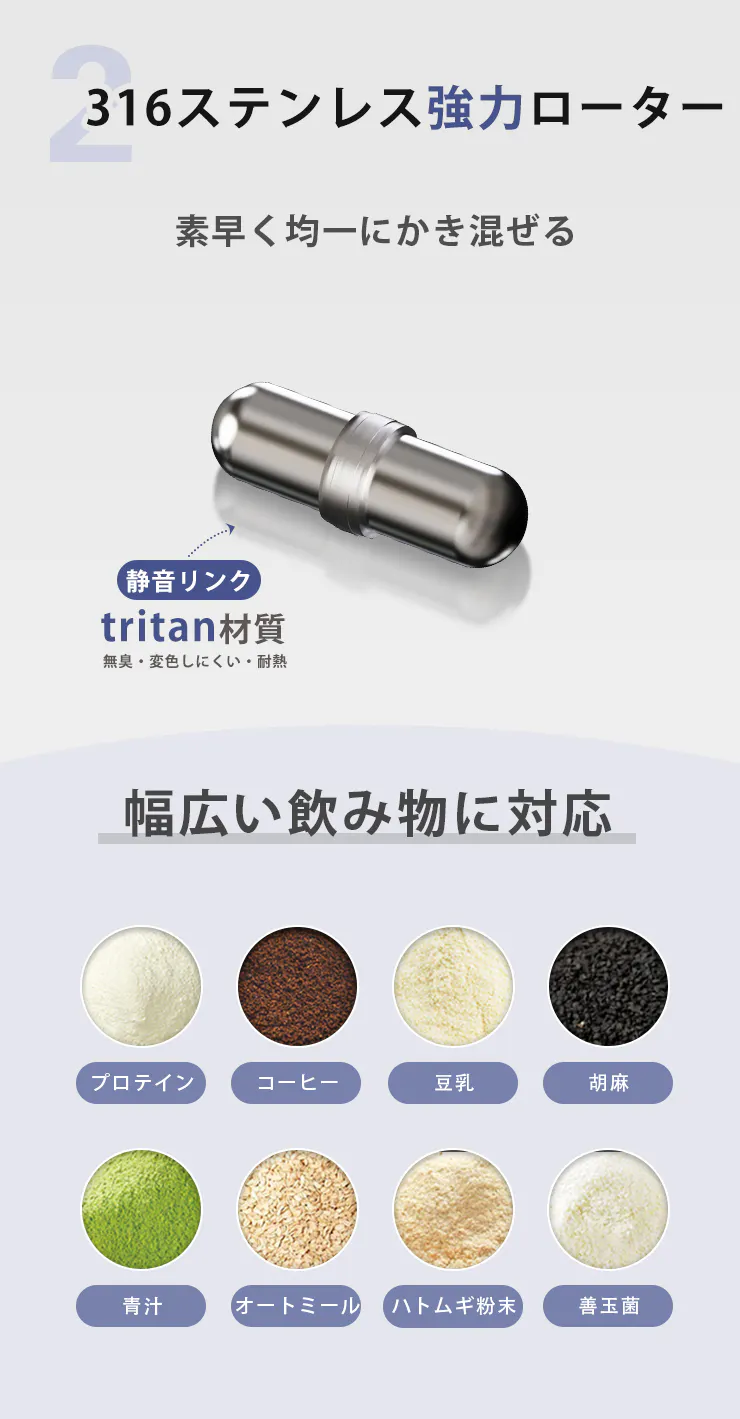 シングルタップで起動モードに、ダブルタップでローターが回転を開始。2段階のスピード切替により、軽いドリンクから濃厚なプロテインまで自在にブレンドできます。
