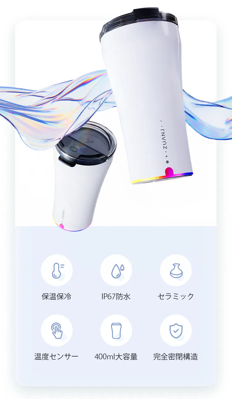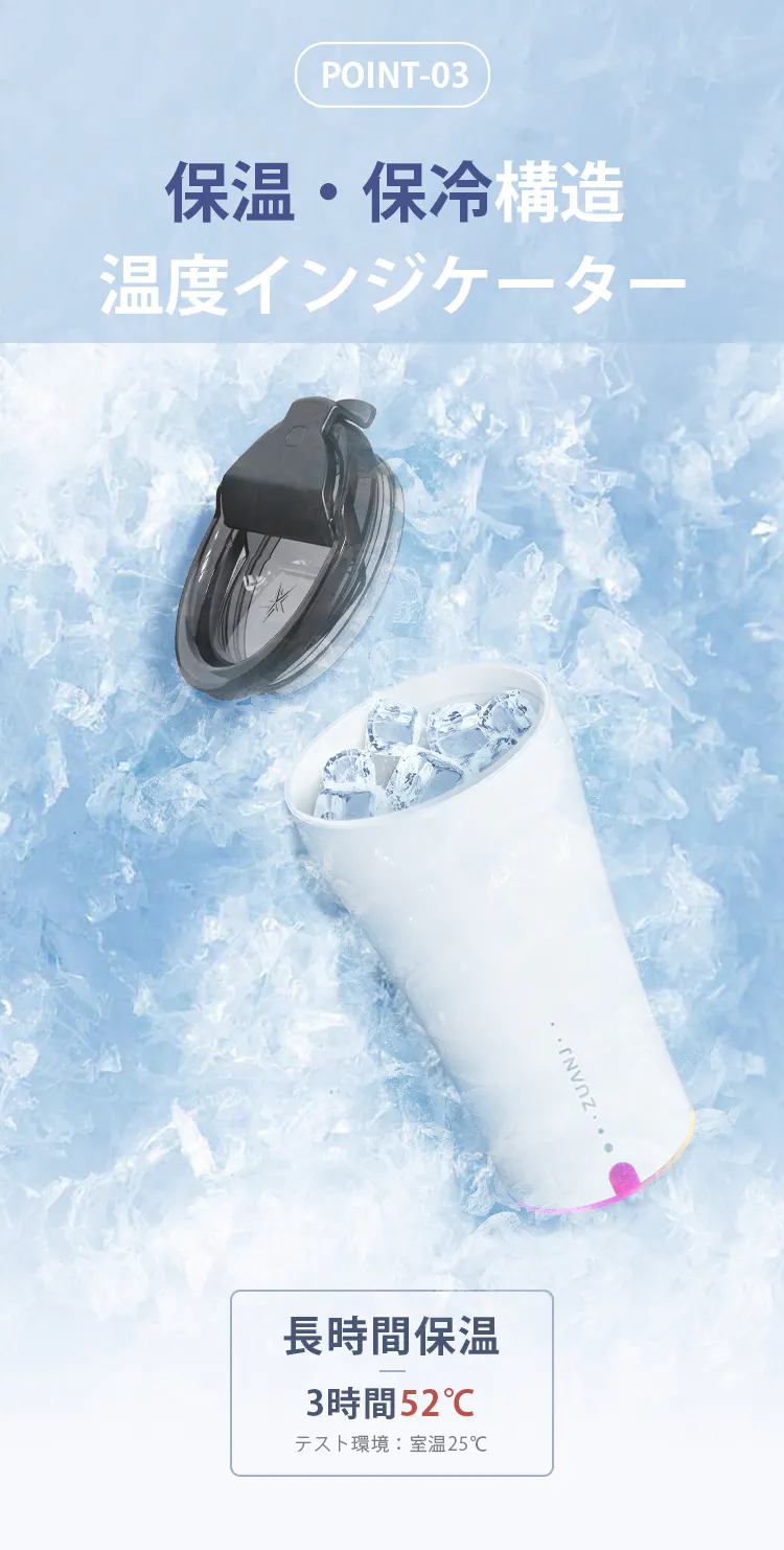 カップ本体は二重構造(304ステンレス+セラミック層)で最大3時間の保温・保冷を実現。寒い季節でもドリンクがすぐ冷める心配はありません。