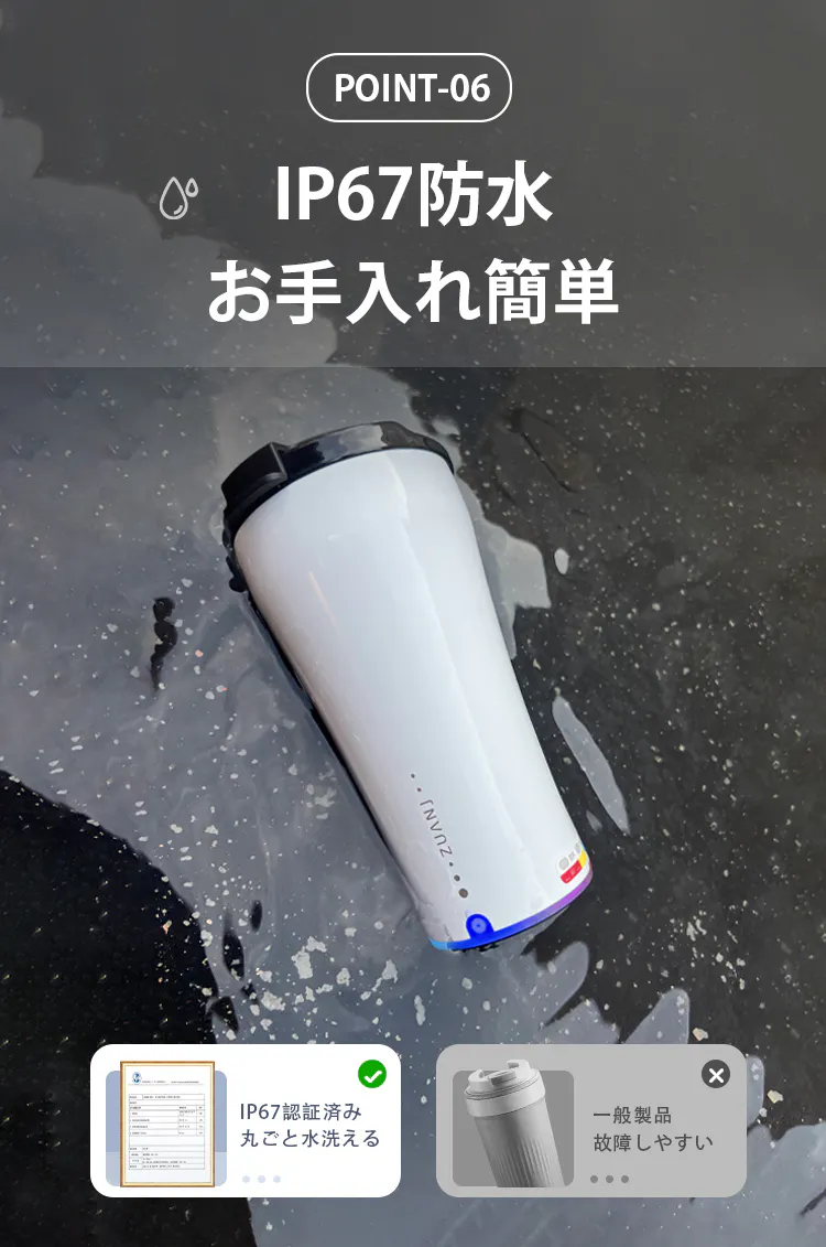 本製品はIP67の防水設計を採用しており、カップ全体を丸ごと水で洗浄可能。飲み残しや粉末の付着も簡単に洗い流せるため、毎日のメンテナンスが非常に楽です。