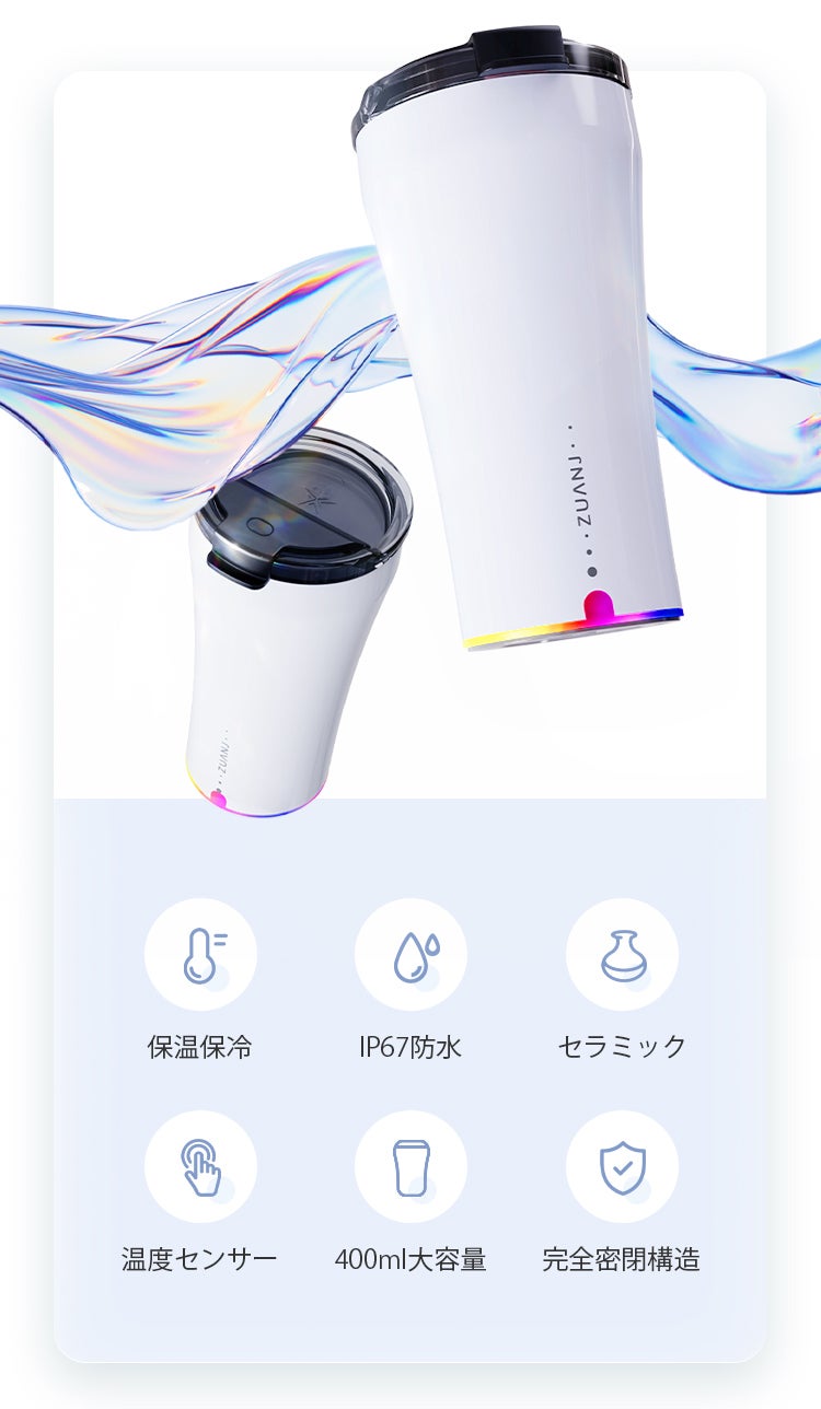 底部には温度センサーと重力センサーを搭載しており、カップを手に取るだけで温度表示が自動で点灯。3段階の温度表示で熱すぎる飲み物によるやけども防げます。