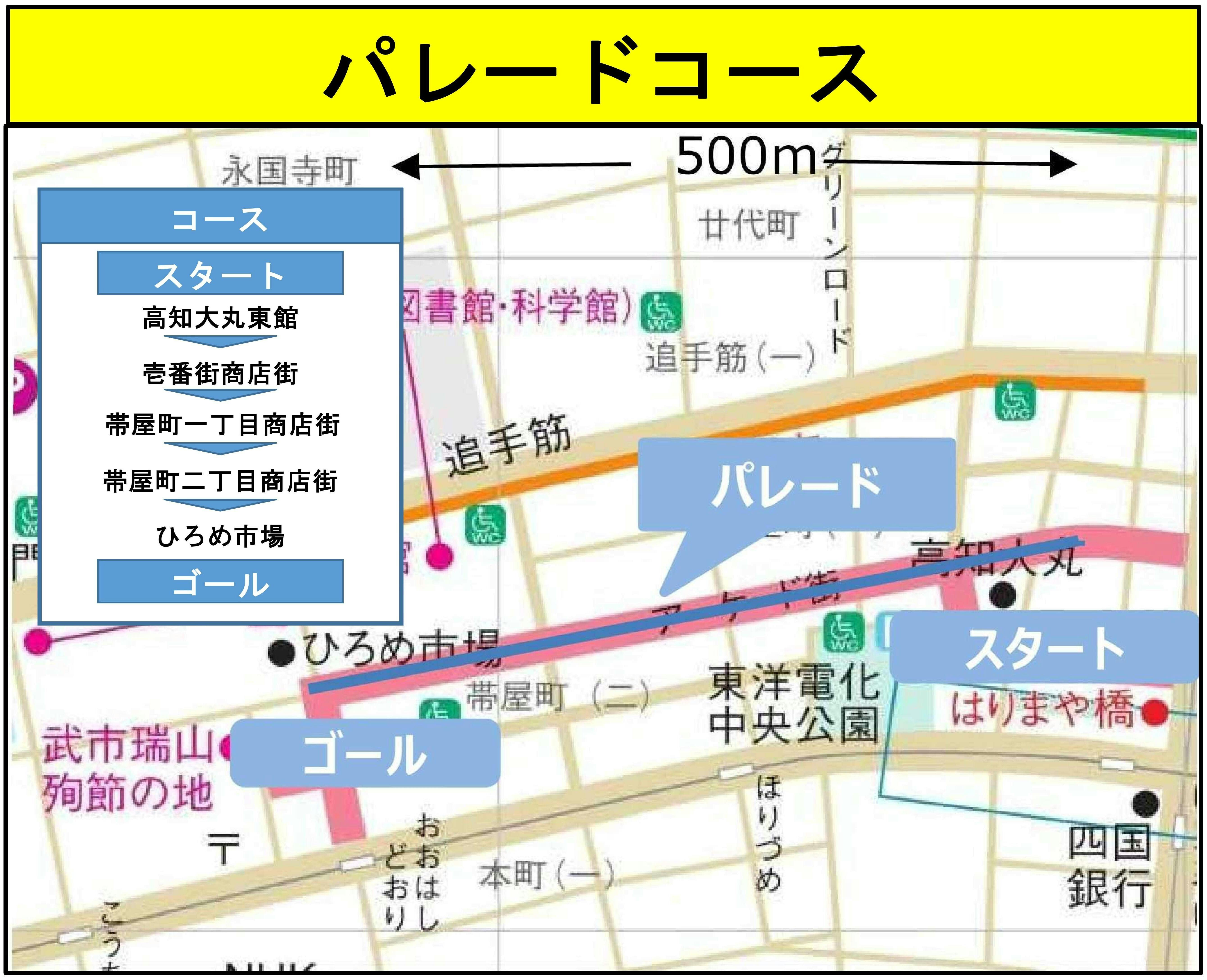 パレードコース:高知大丸東館付近→壱番街商店街・帯屋町一丁目商店街・帯屋町二丁目商店街→ひろめ市 場