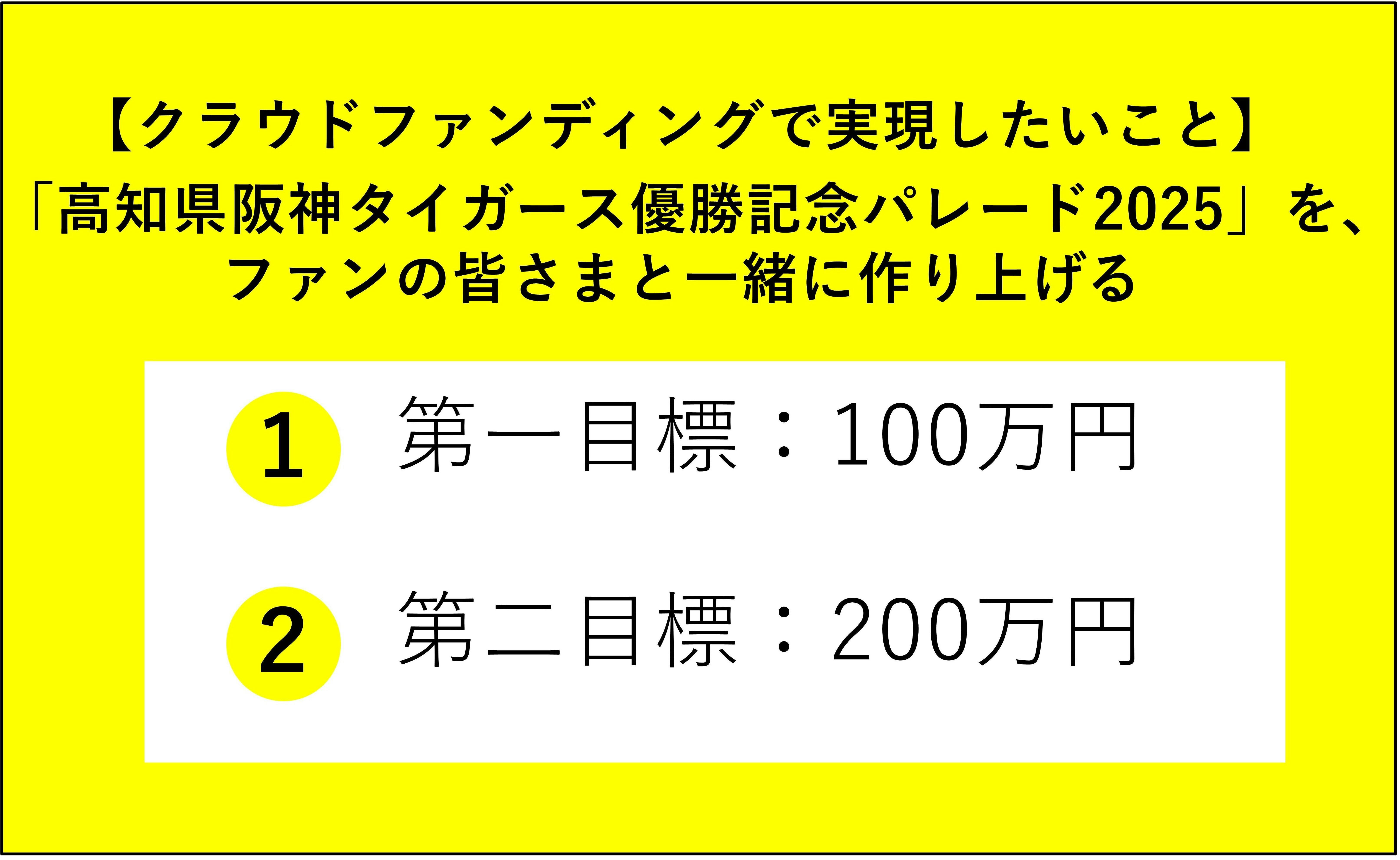 2025/11/13 14:03【寄附のお礼】このたびは、高知県阪神タイガース優勝記念パレードへのクラウドファンディングにご支援・ご協力を賜り、誠にありがとうございました。皆さまからの温かいご支援のおかげで、無事に高知県阪神タイガース優勝記念パレードを実施することができました。当日は、約13,000人(速報)もの皆さまにご来場いただき、高知市中心部の帯屋町エリアが阪神タイガース一色に染まり、盛況のうちにパレードを終えることができました。これもひとえに、ご支援くださった皆さまのお力添えの賜物であり、心より感謝申し上げます。今後も、実行委員会一同は、それぞれの立場で高知県と阪神タイガースの関係強化を図ってまいります。引き続き温かいご支援・ご協力を賜りますよう、よろしくお願いいたします。なお、高知県阪神タイガース優勝記念パレードの様子は、下記のURLに掲載していますので、ぜひご覧ください。https://sporu-kochi.com/sports/watch-sports/support-baseball/hanshintigers-parade2025/【返礼品の発送】返礼品につきましては、12月初旬を目処に順次発送させていただきます。もうしばらくお待ちいただきますよう、よろしくお願いいたします。高知県阪神タイガース優勝記念パレード実行委員会 もっと見る【残り1日!】プロジェクトの拡散のご協力のお願い
