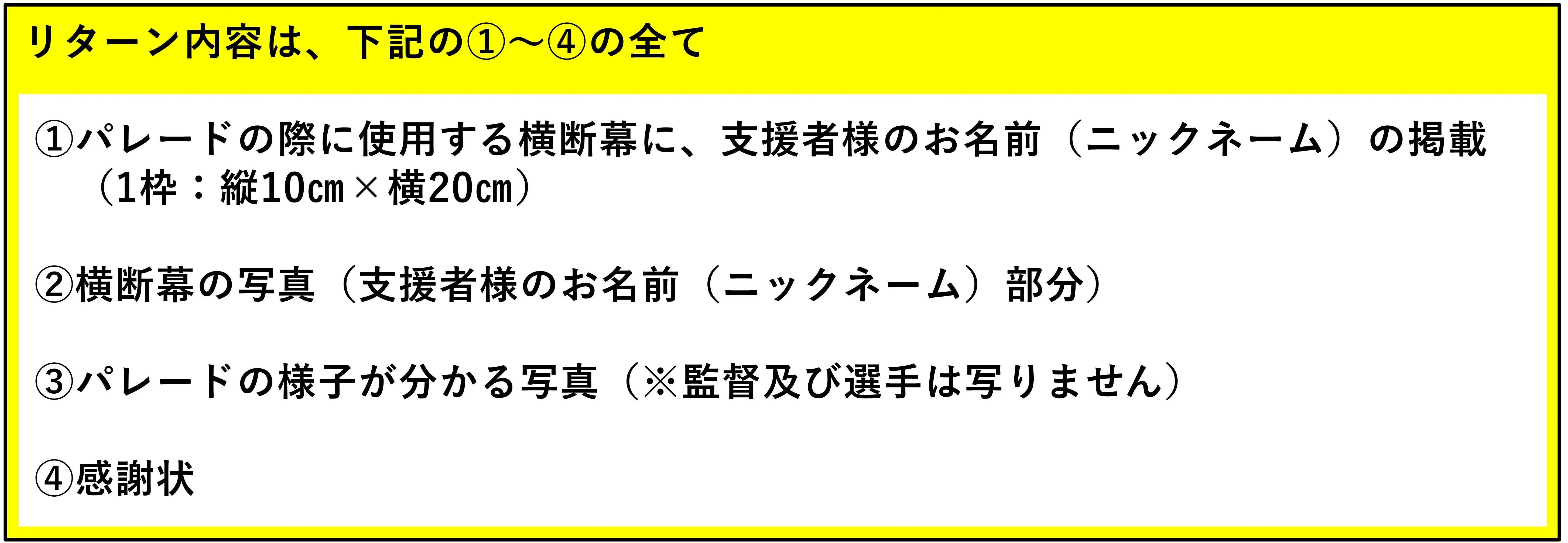 本クラウドファンディングのコンセプトは、「チームとファンの皆さまが一緒に創る、特別な時間」です。ご支援いただいた皆さまへのリターンとして、一緒にこの特別な時間を分かち合え、思い出に残していただけるよう、下記の返礼品をご用意しました。